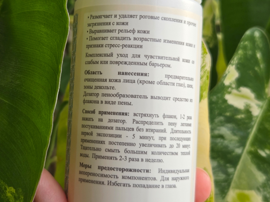 В составе 99% натуральных компонентов. Не содержится отдушек и эфирных масел. В основе содержит энзимный эксфолиант, молочную кислоту и гидролаты полезных растений, например розы и ромашки.