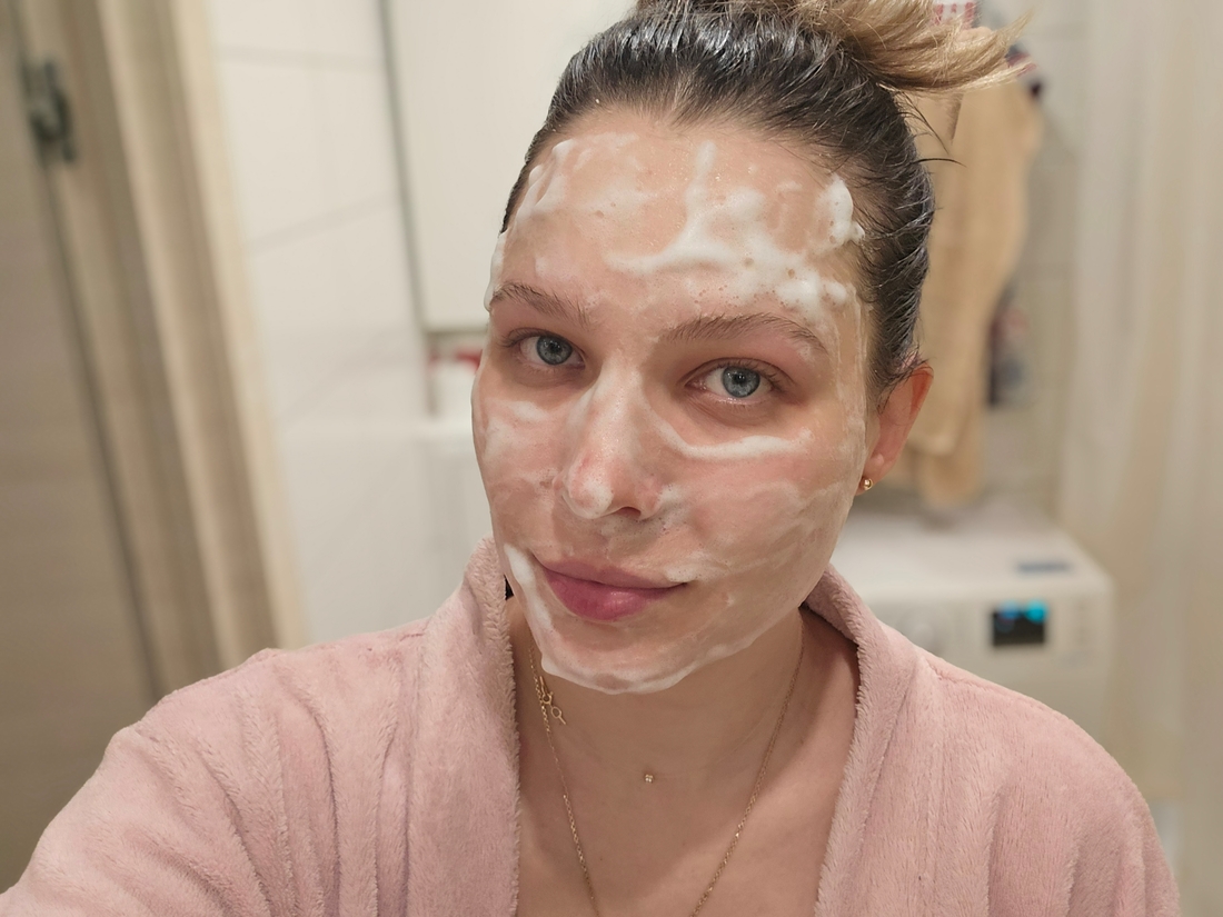 Наношу я ее обычно вечером, после снятия косметики и умывания гелем, на очищенную кожу. Она легко наносится и не стекает, спокойно можно заниматься своими делами примерно 20 минут. Первые минуты ошушаются как приятные пузырьки шампанского на коже, затем ощущается как комфортная легкая пленочка на лице. После смываю водой, наношу тоник и произвожу дальнейший уход по поставленной задаче.