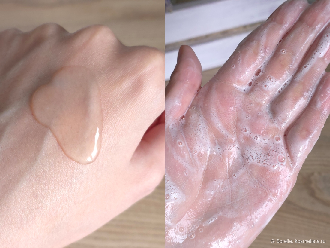 Текстура гелевая, средняя по густоте. Пенится шампунь нормально, я давно привыкла к продуктам с мягкими ПАВами) На волосах пена получается, конечно, лучше, чем на руке.