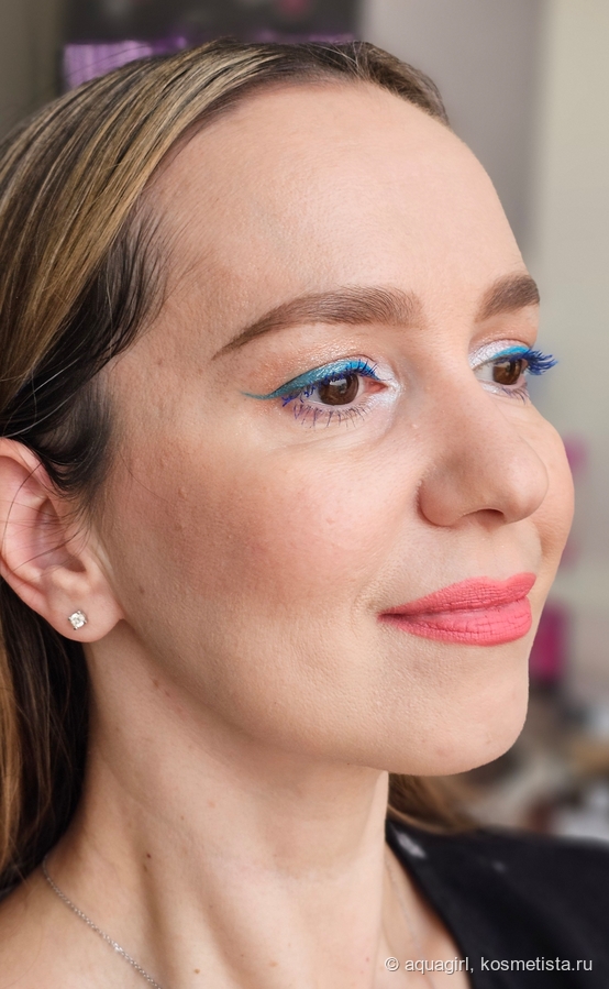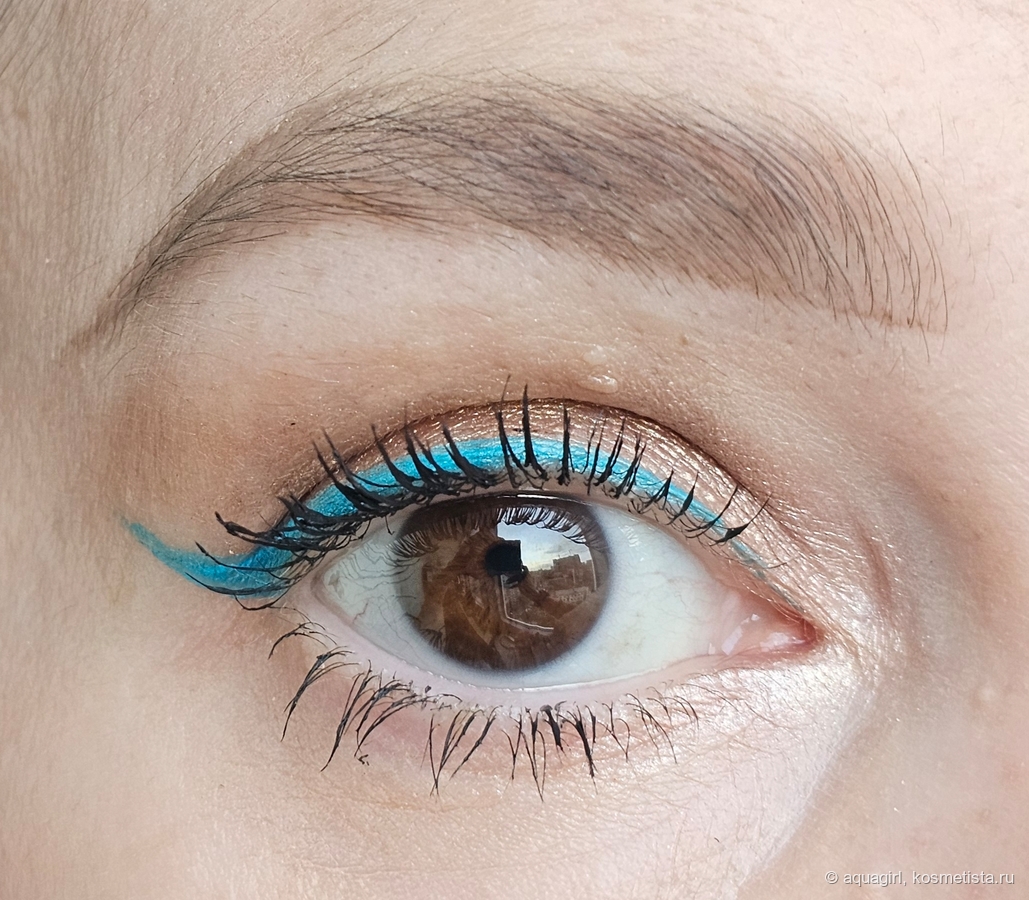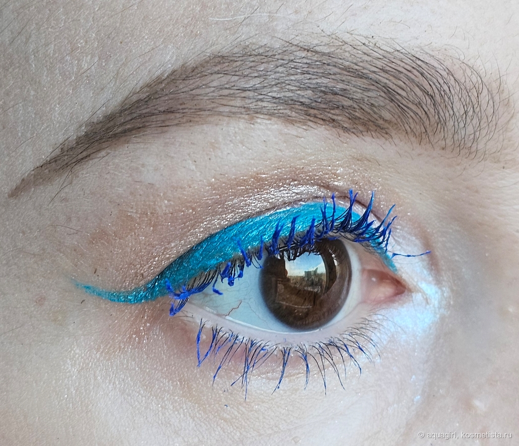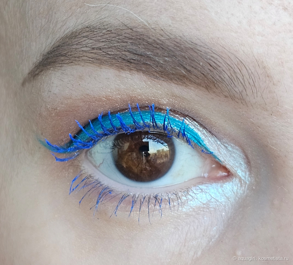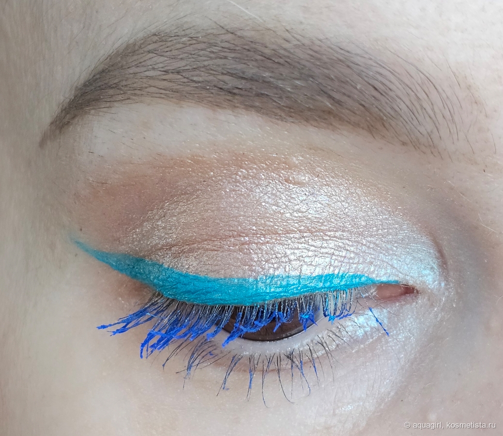 Попробовала совместить в одном макияже голубую подводку и синюю тушь — получилось, вроде бы, неплохо.
