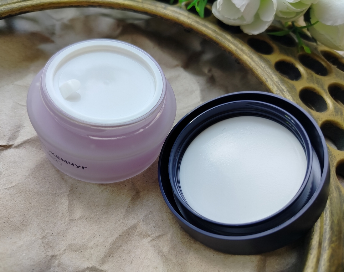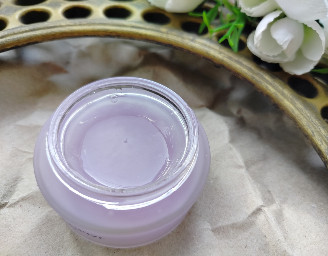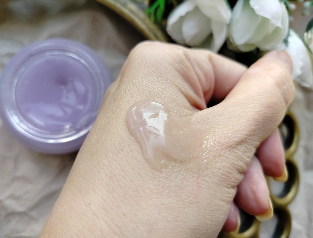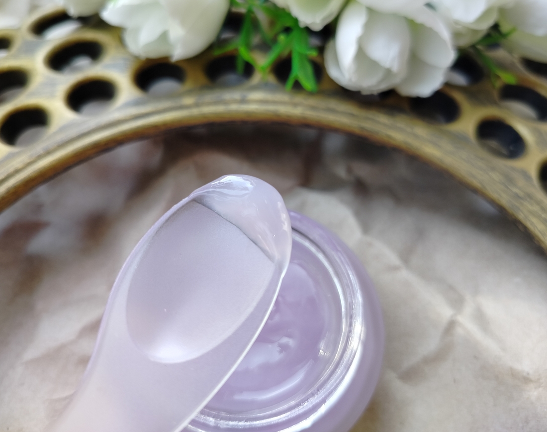 Консистенция у маски — гелевая, средней густоты, приятный лавандовый оттенок присутствует только в баночке — при нанесении гель становится прозрачным. Аромат — легкий, цветочный.