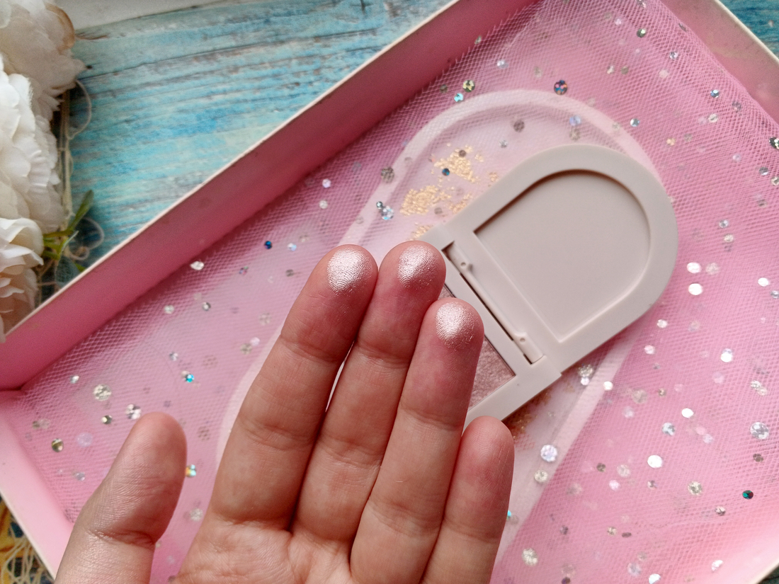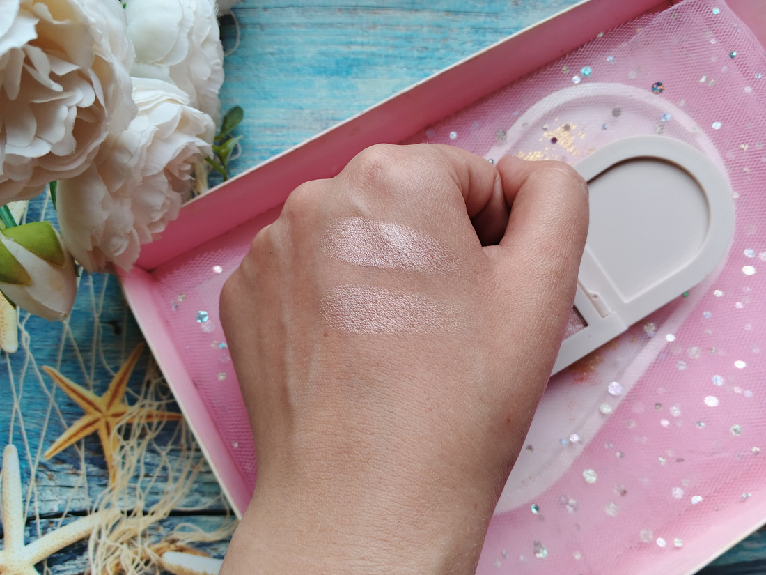 Текстура кремовая, шелковисто-пудровая. Набираю её исключительно пальцами. Сияние мелкодисперсное, без явного шиммера.