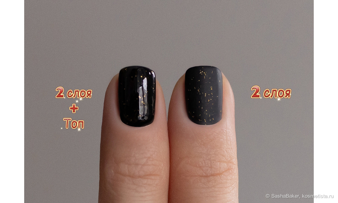 Глянцевый топ добавляет ту самую глубину цвету, черное, ночное небо с россыпью золотых звезд. Очень сложно стало уловить цвет на камере, потому что и без того на улице темень страшная, а лак еще темней стал. С глянцевым топом я ношу чаще, чем с матовым финишем.