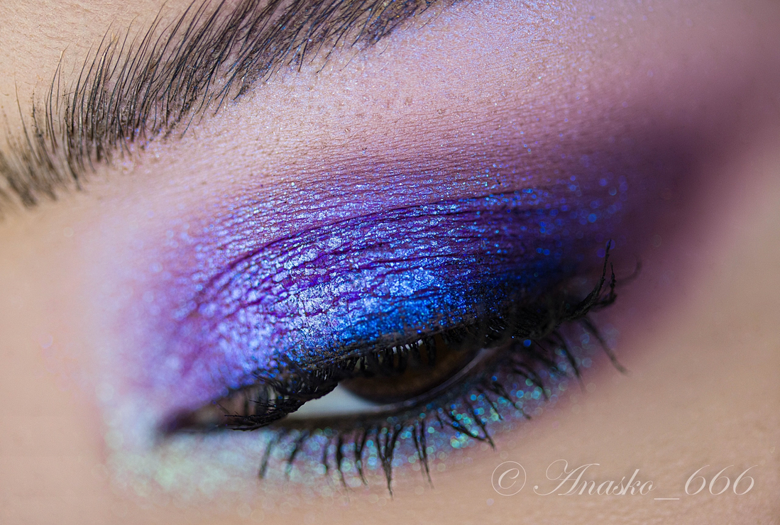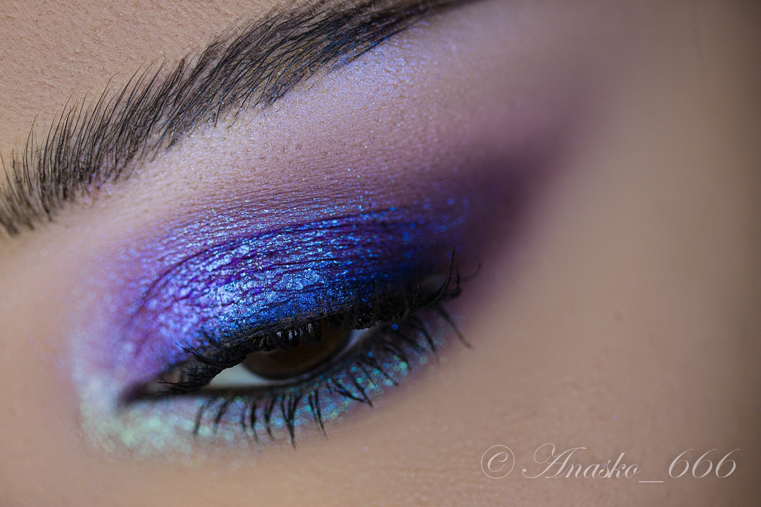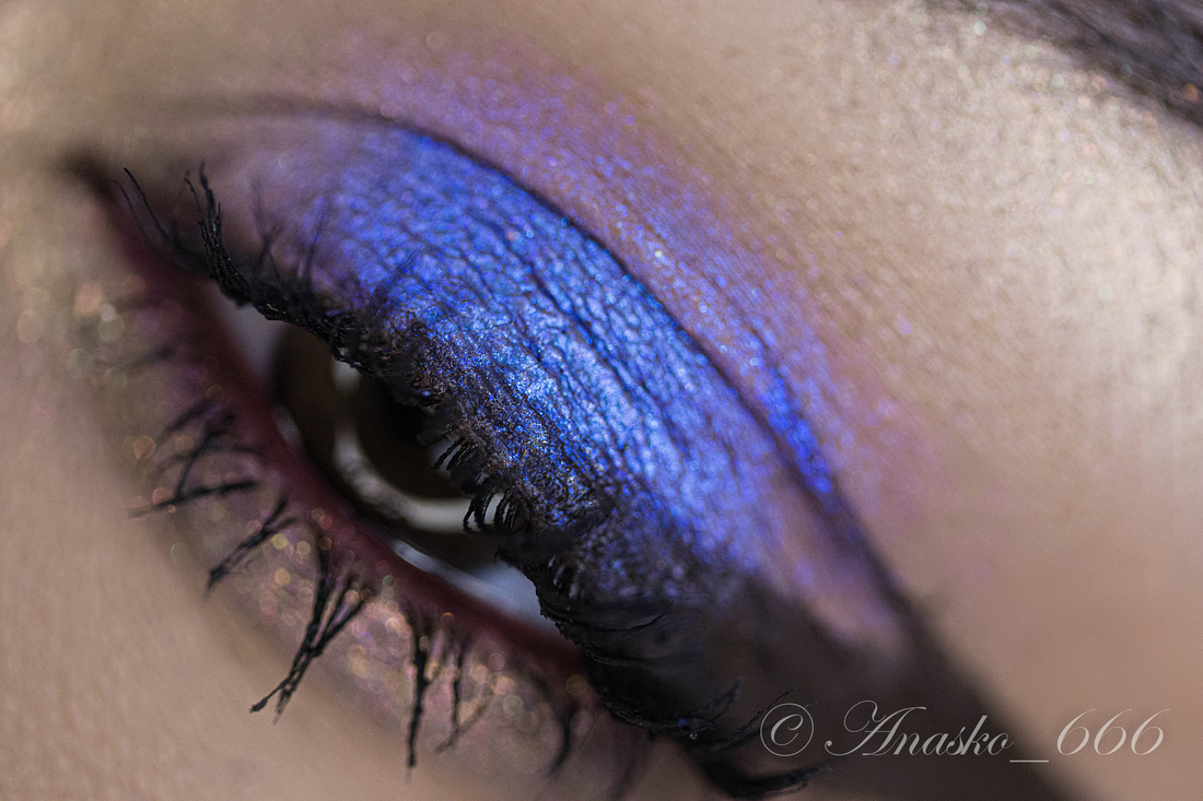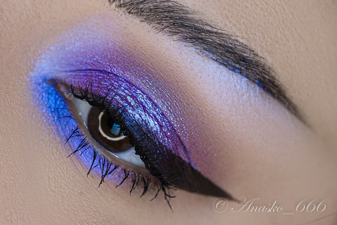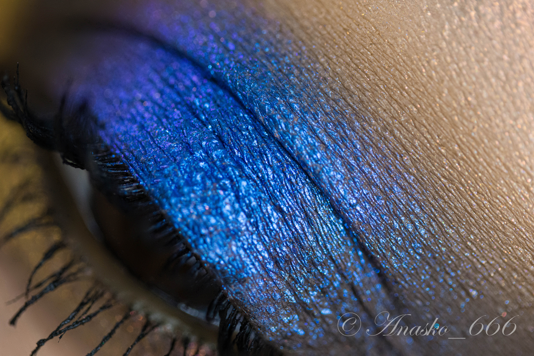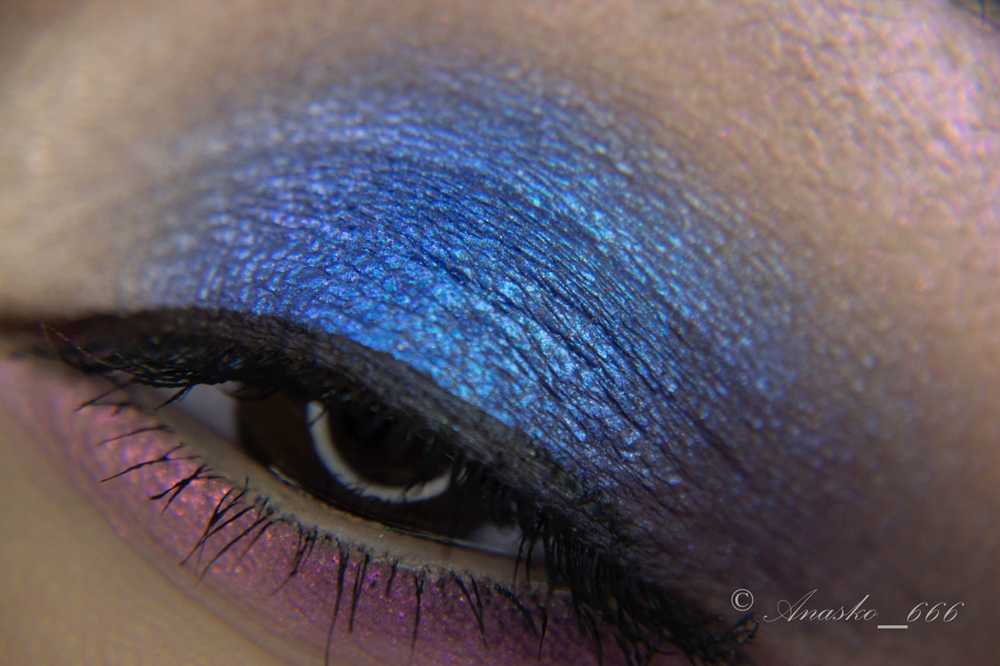 Неоново-синий нежный по помолу сатин. База прозрачная, ложится полупрозрачно, почти хайлайтерно.