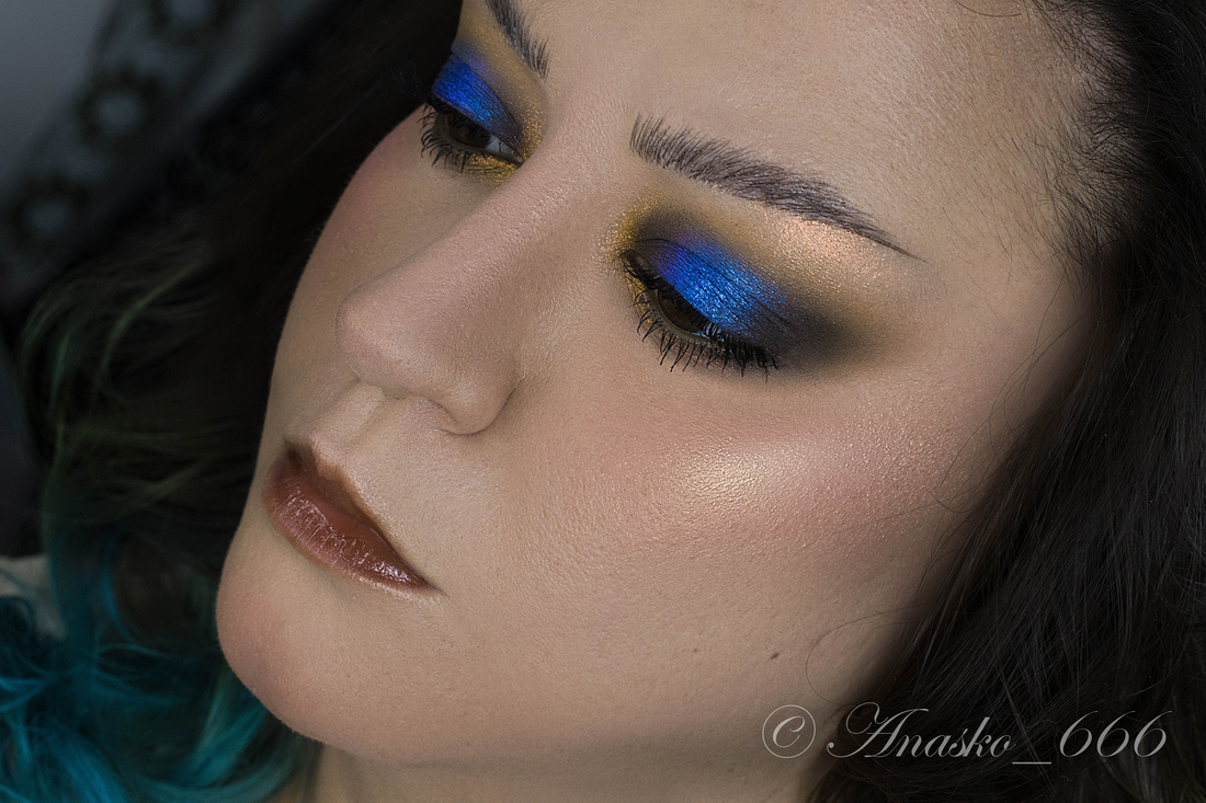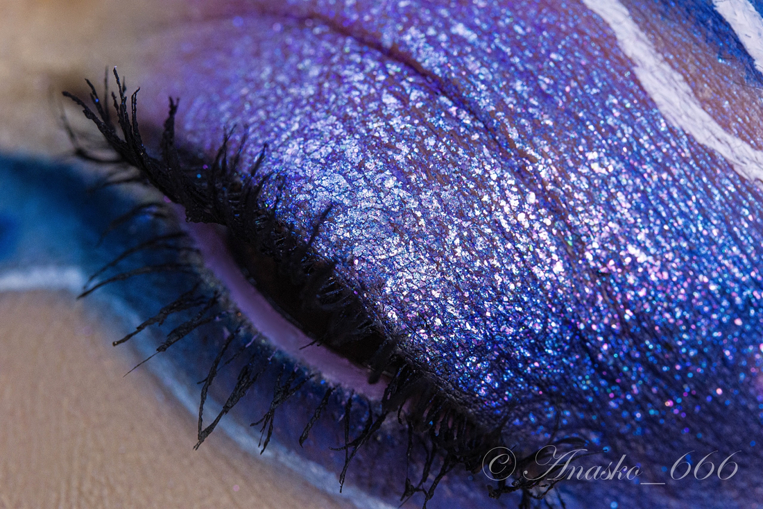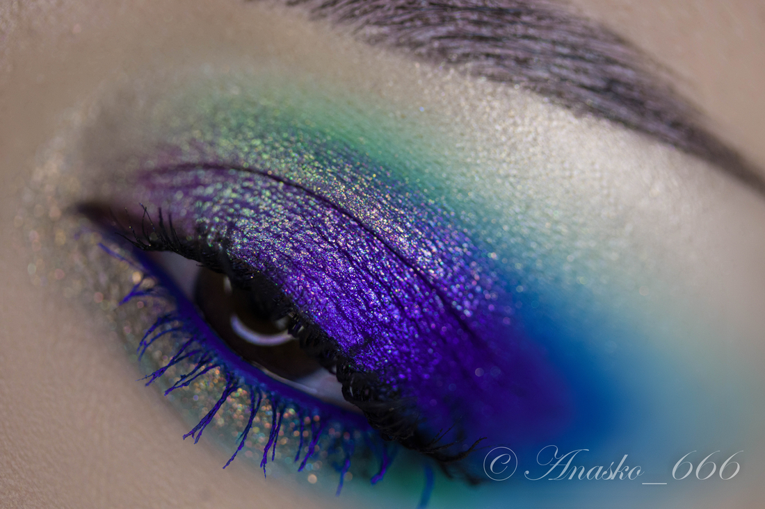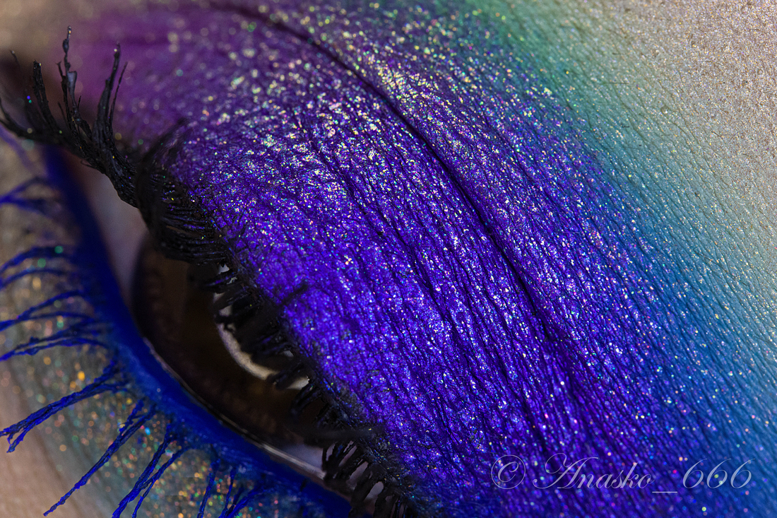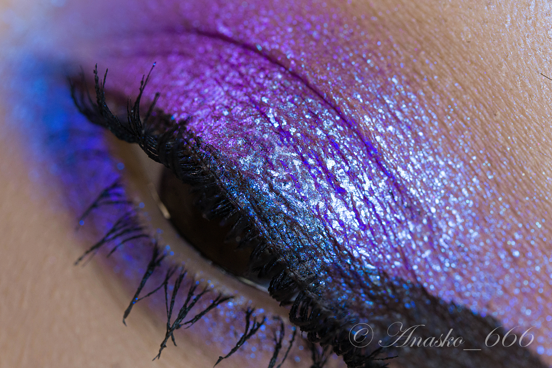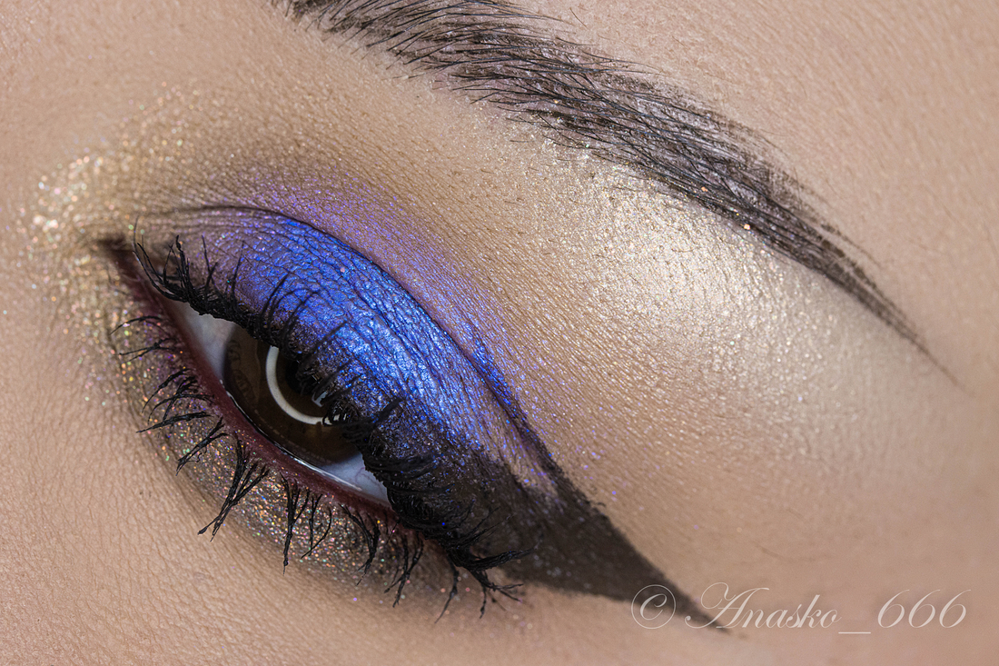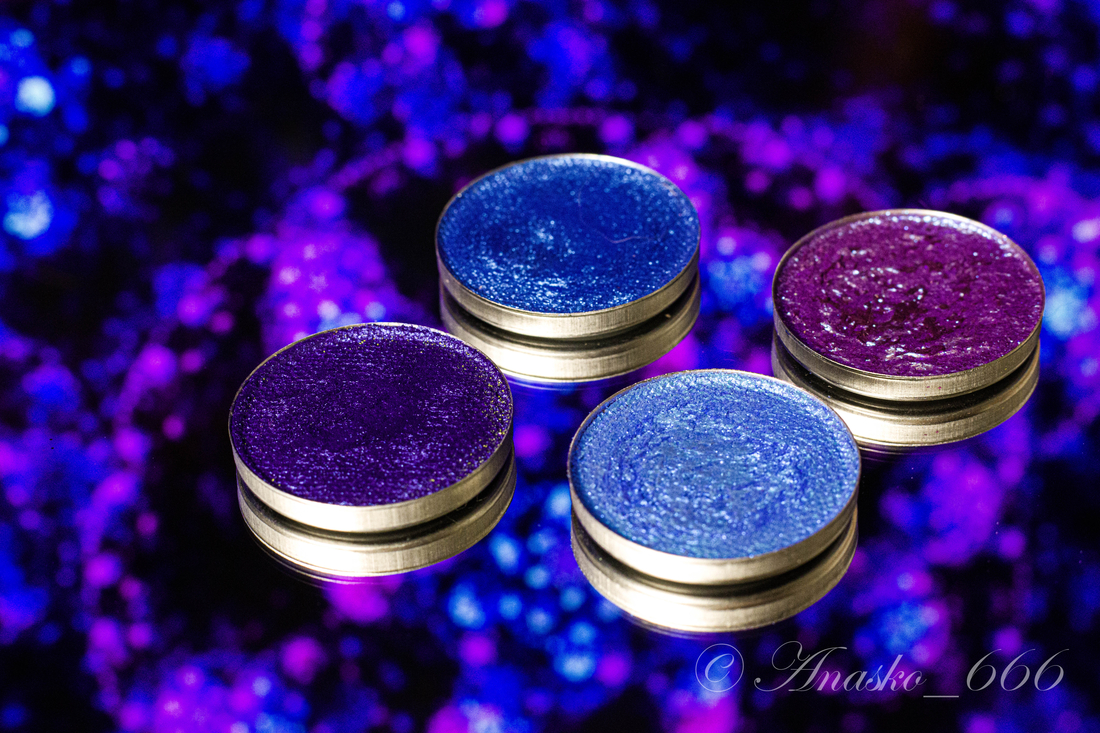 Неоново-синий нежный по помолу сатин. База прозрачная, ложится полупрозрачно, почти хайлайтерно.