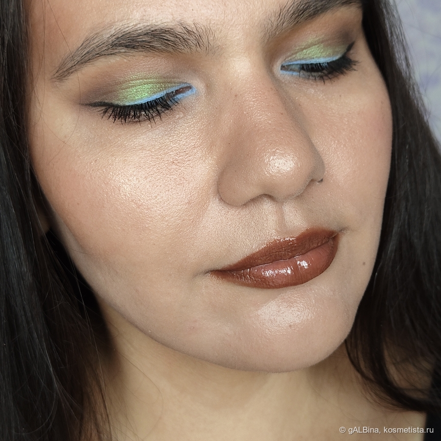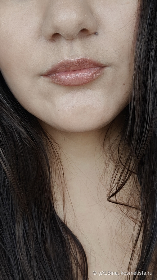 Хоть оттенок и выглядит как будто бы довольно ярко, но вроде в макияже смотрится вполне нюдово.