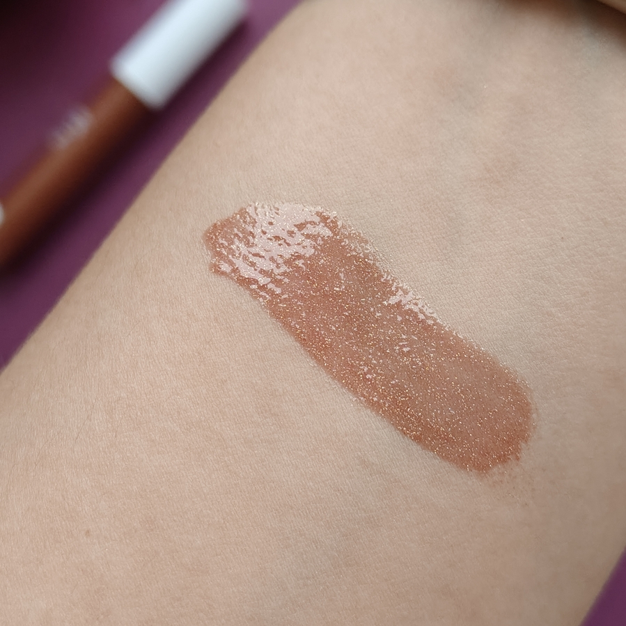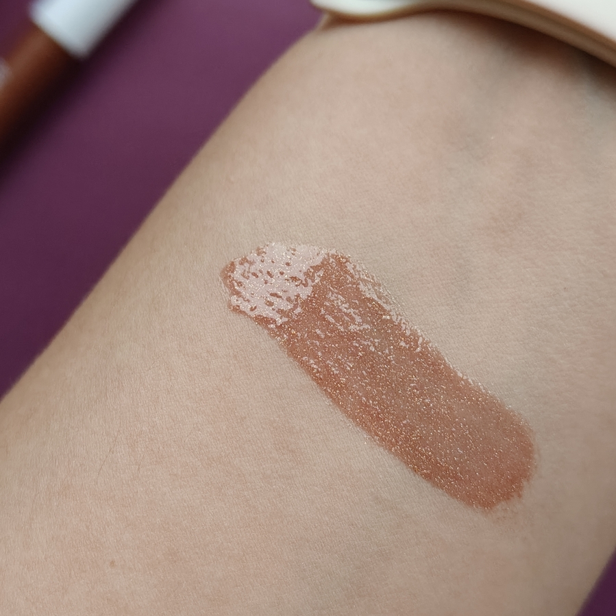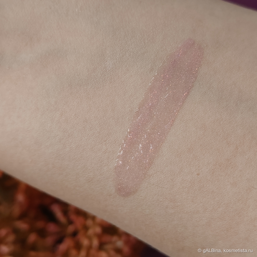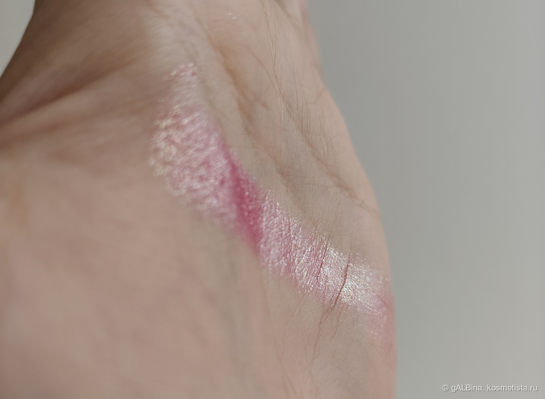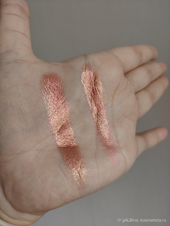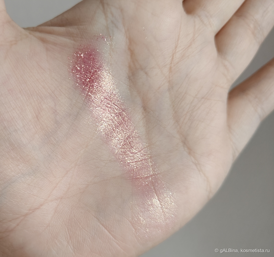 Золотое сияние на розовой базе, сатин. На свотче оставляет тинт, при удалении макияжа не заметила его.