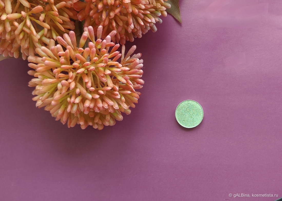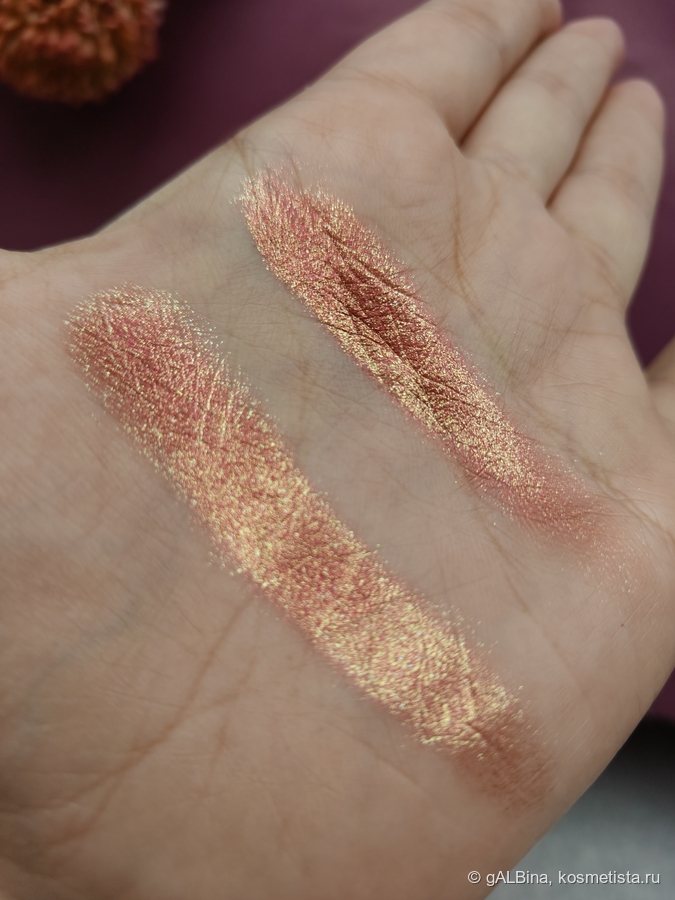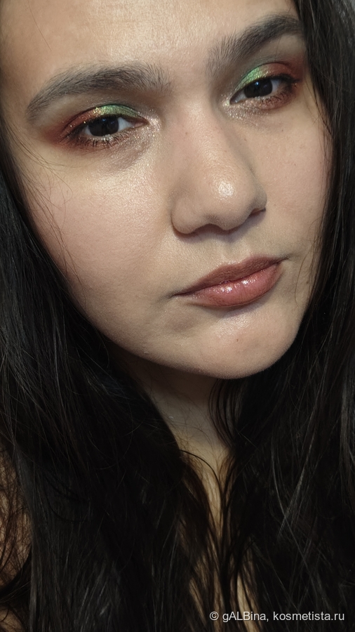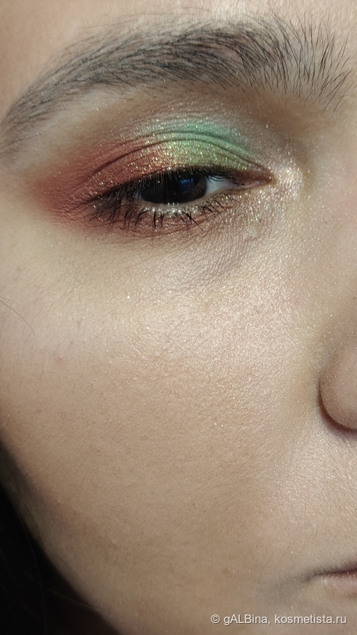 По описанию это зеленоватый шиммер на бордовой базе. Я больше вижу золотые блёстки на рыжей базе.