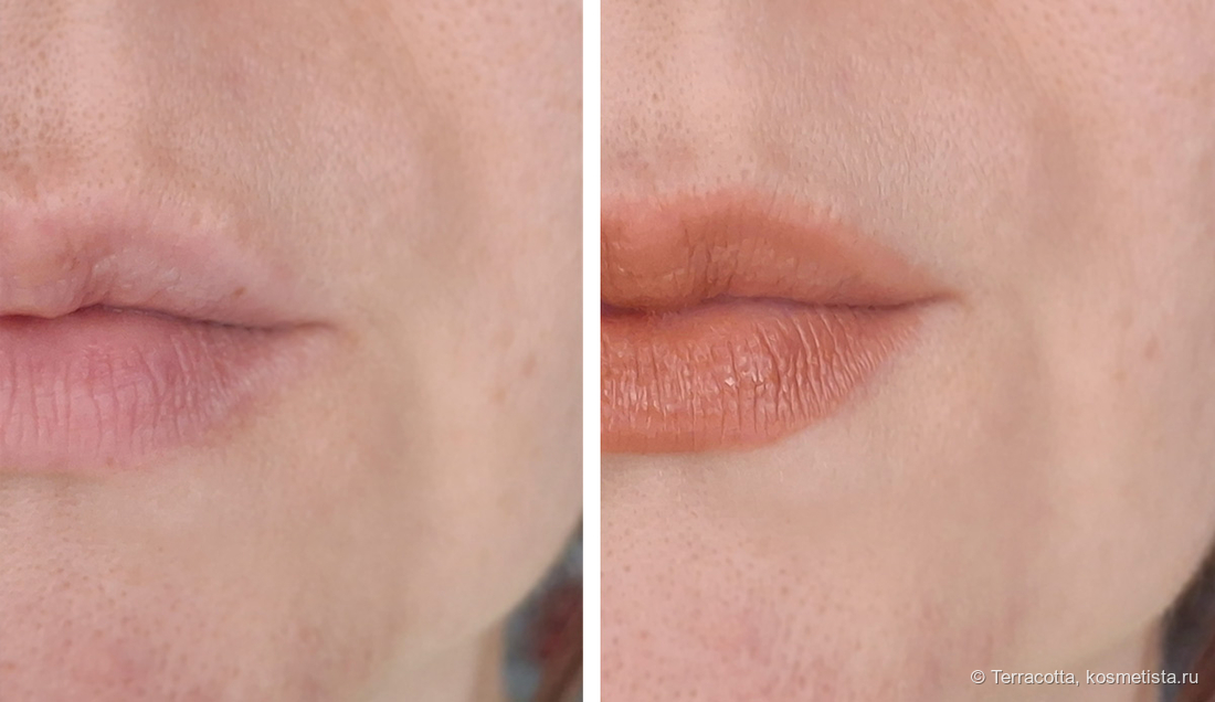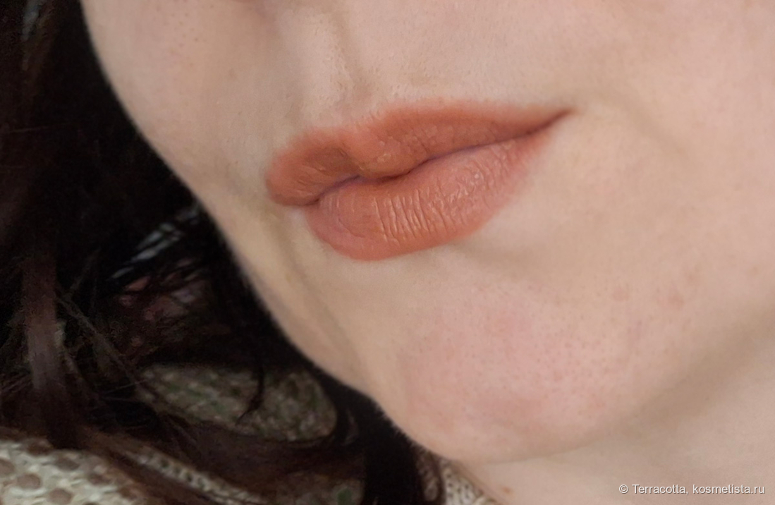 Очень жаль, потому что лежит она отлично. Можно нанести плотным слоем, можно легким вбивающим, в обоих случаях будет все отлично. Как видно, она не скукоживает губы, не подчеркивает текстуру.