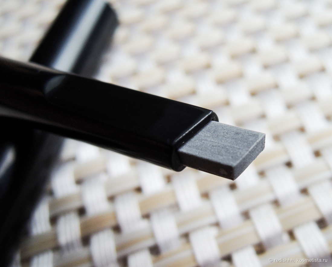Черный пластиковый корпус карандаша стандартный для такого типа средств: с одной стороны сам грифель, а с другой — щеточка. Надписи на футляре сделаны качественно и за время использования не стираются. Вот так выглядит новый карандаш. Грифель серого, буквально, гранитного оттенка и прямоугольной формы. Но не пугайтесь! Стоит им начать пользоваться — он тут же начнет стачиваться и станет темно-коричневым. Он автоматический и не требует заточки.