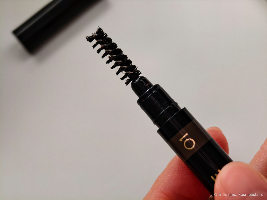 С другой стороны карандаша есть щеточка для бровей, и она действительно полезна. Сначала я причесываю ей бровь, далее рисую волоски. При необходимости причесываю еще раз, если хочу немного снизить интенсивность цвета. Далее уже использую гель для бровей, у меня от Pusy. Конкретно этот гель не растворяет/не стирает карандаш, про другие не подскажу. После геля еще раз использую щеточку, чтобы убрать излишки геля с волосков. Раз в неделю щеточку мою.