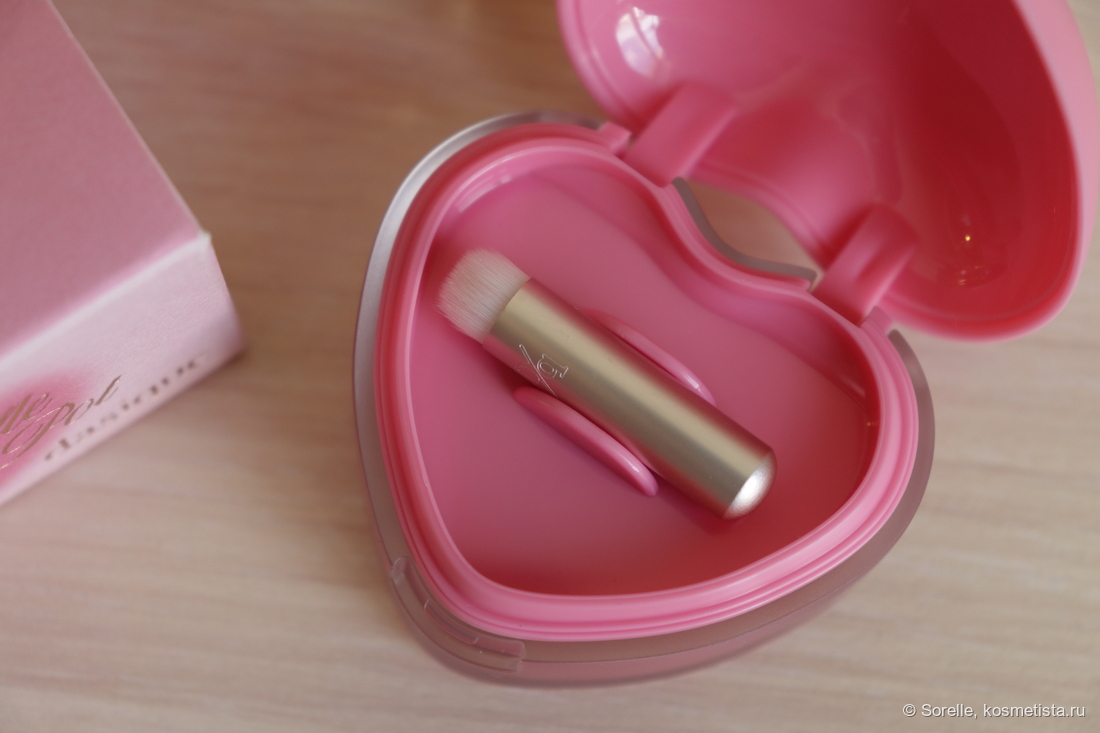 Под крышкой есть заглушка с кисточкой. В целом, кисть подойдет, если вы хотите нанести пудинг на губы, но моя при первой помывке почему-то окрасила воду в оранжевый, что меня напрягло, так что я ей почти не пользуюсь.