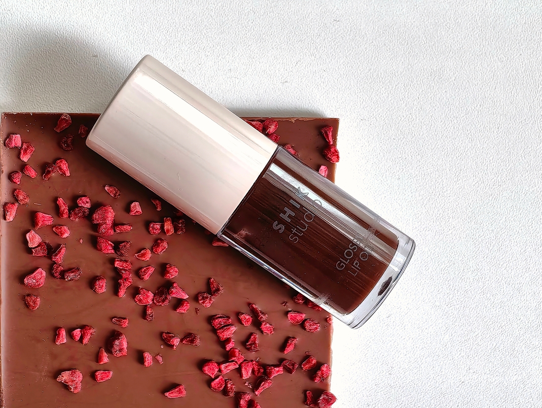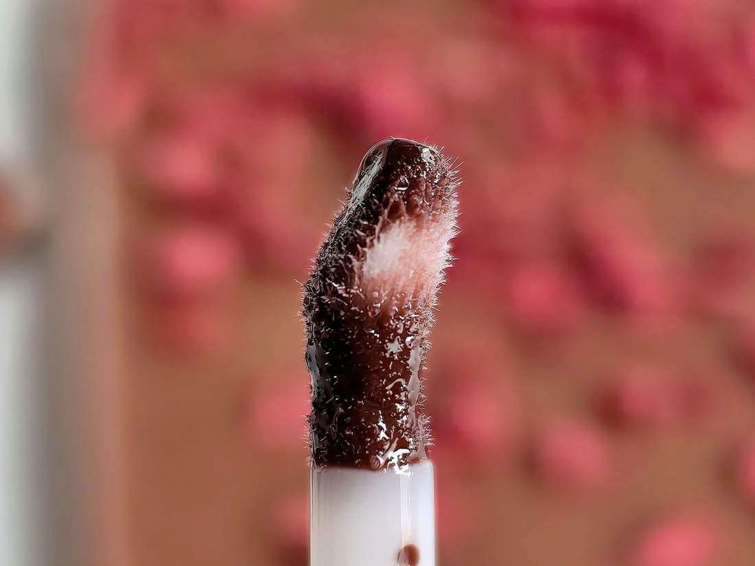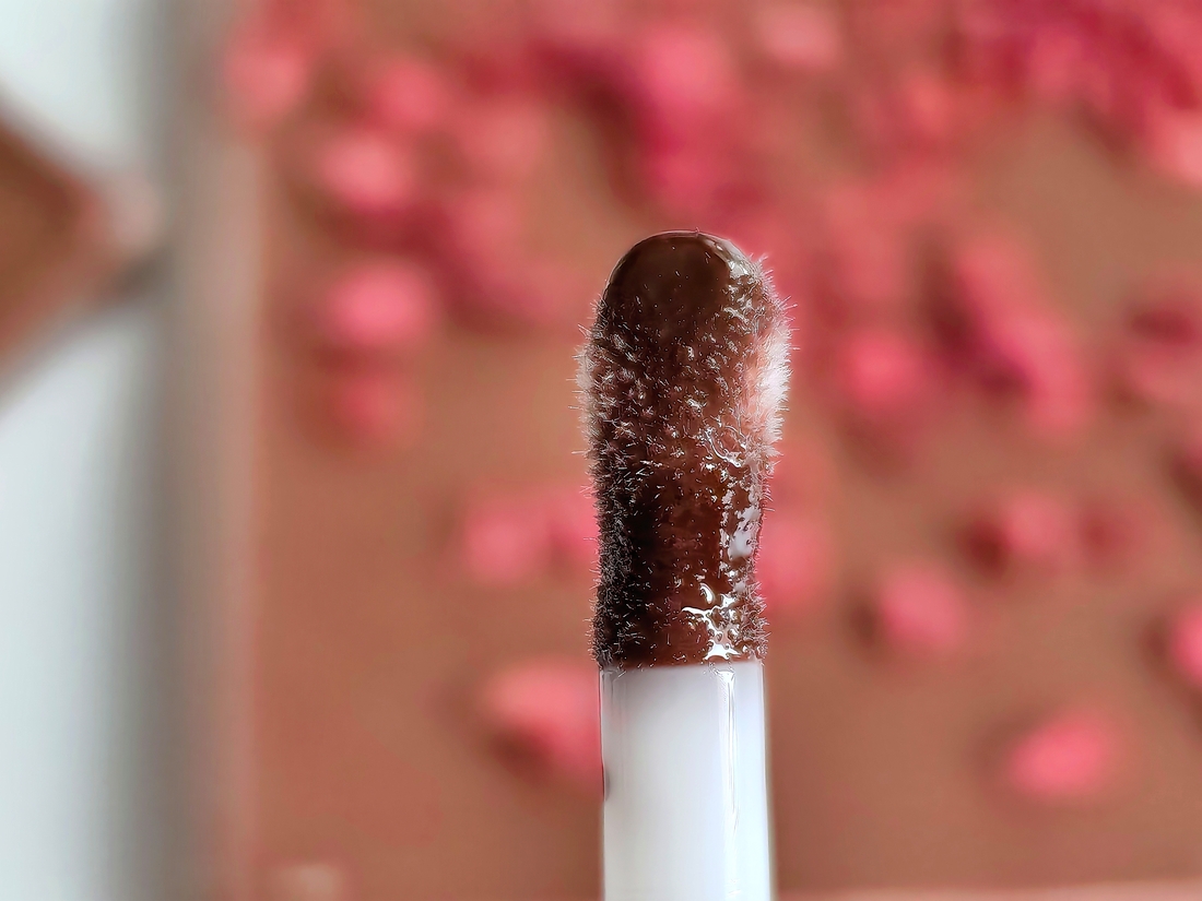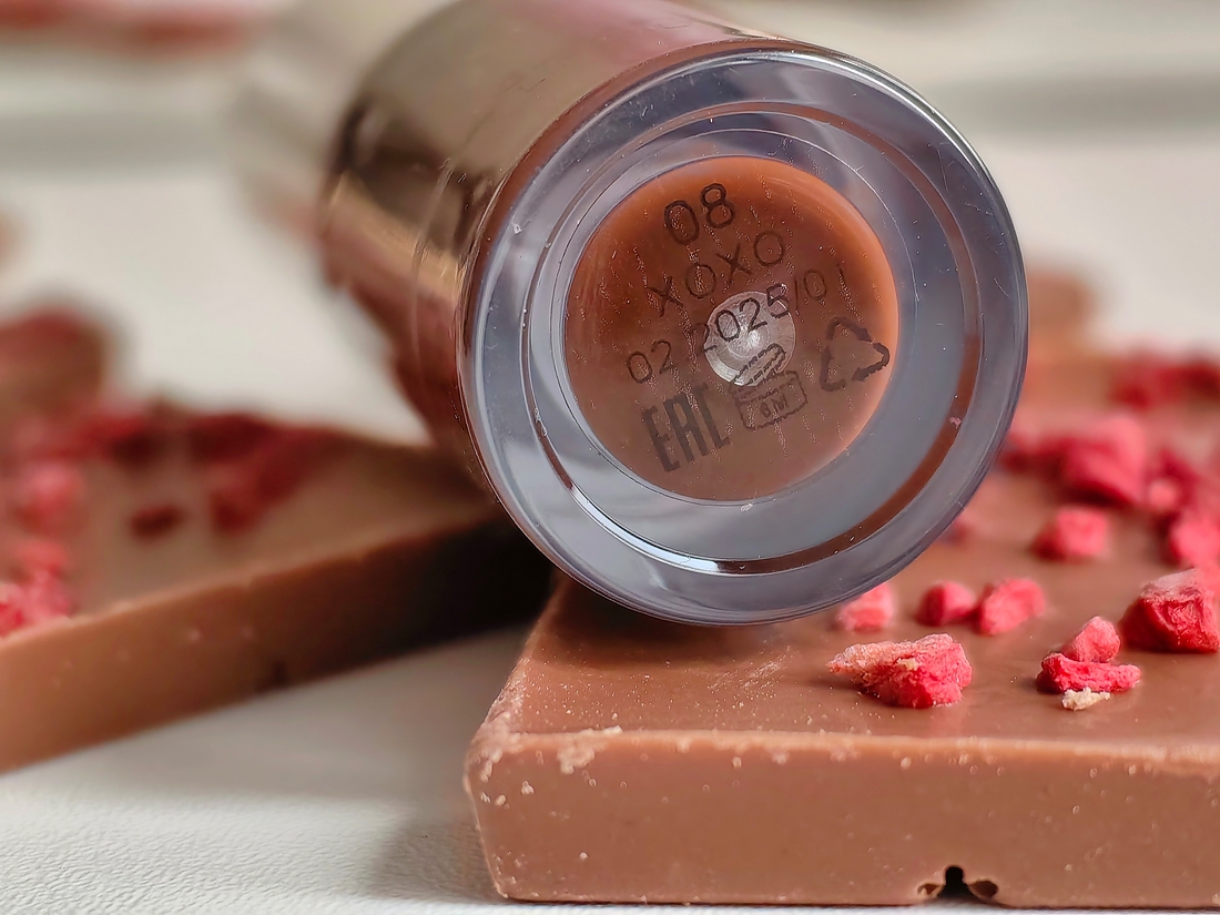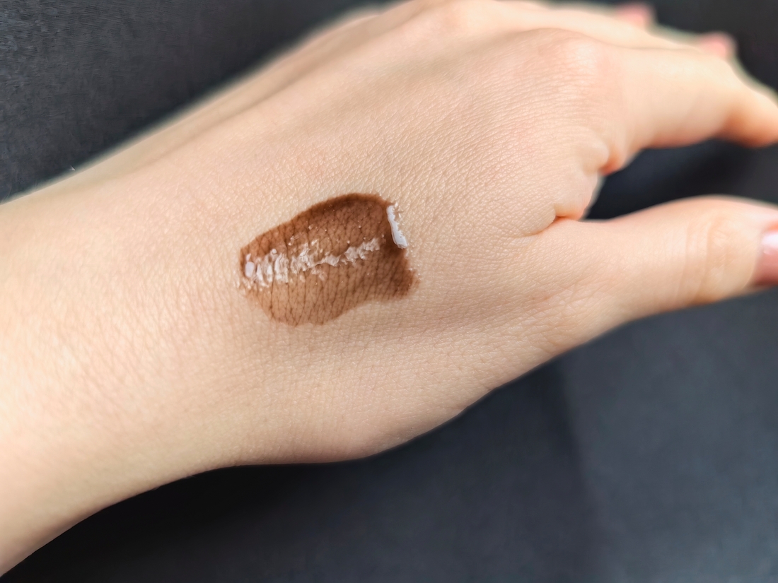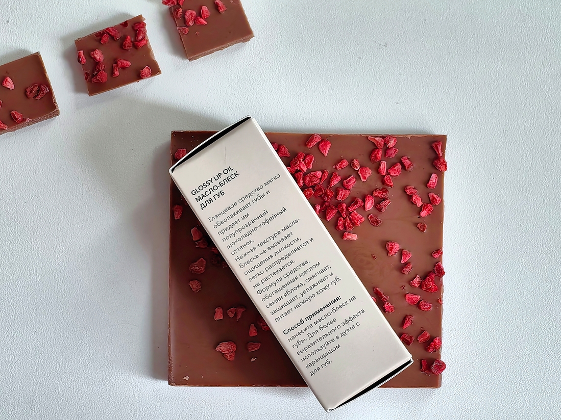 Оттенок у масла полупрозрачный шоколадный, для такого типа продукта достаточно пигментированный. Пигментацию моих губ полностью не перекрывает, но тем не менее придает им выраженный коричневый оттенок. Глянец очень и очень сильный.