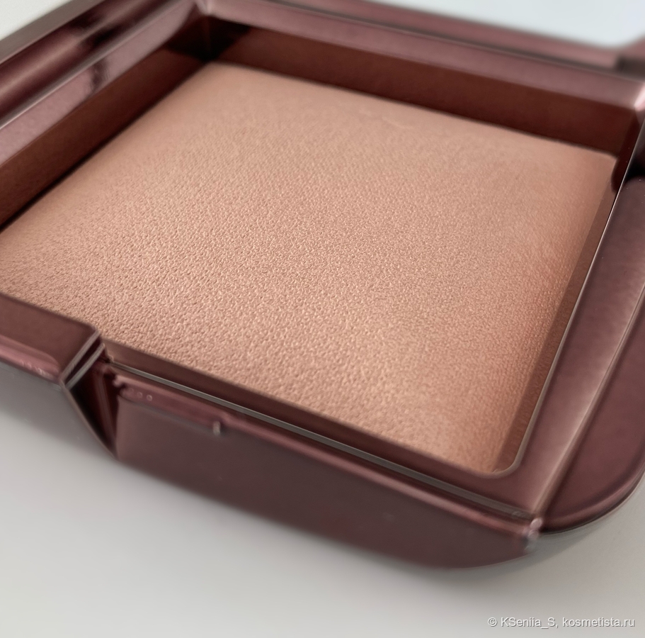 Сама пудреница выглядит скромно, блестящий коричнево-бордовый пластик, легкая, внутри зеркало, пуховка/спонж не предусмотрены. Отдушки нет.