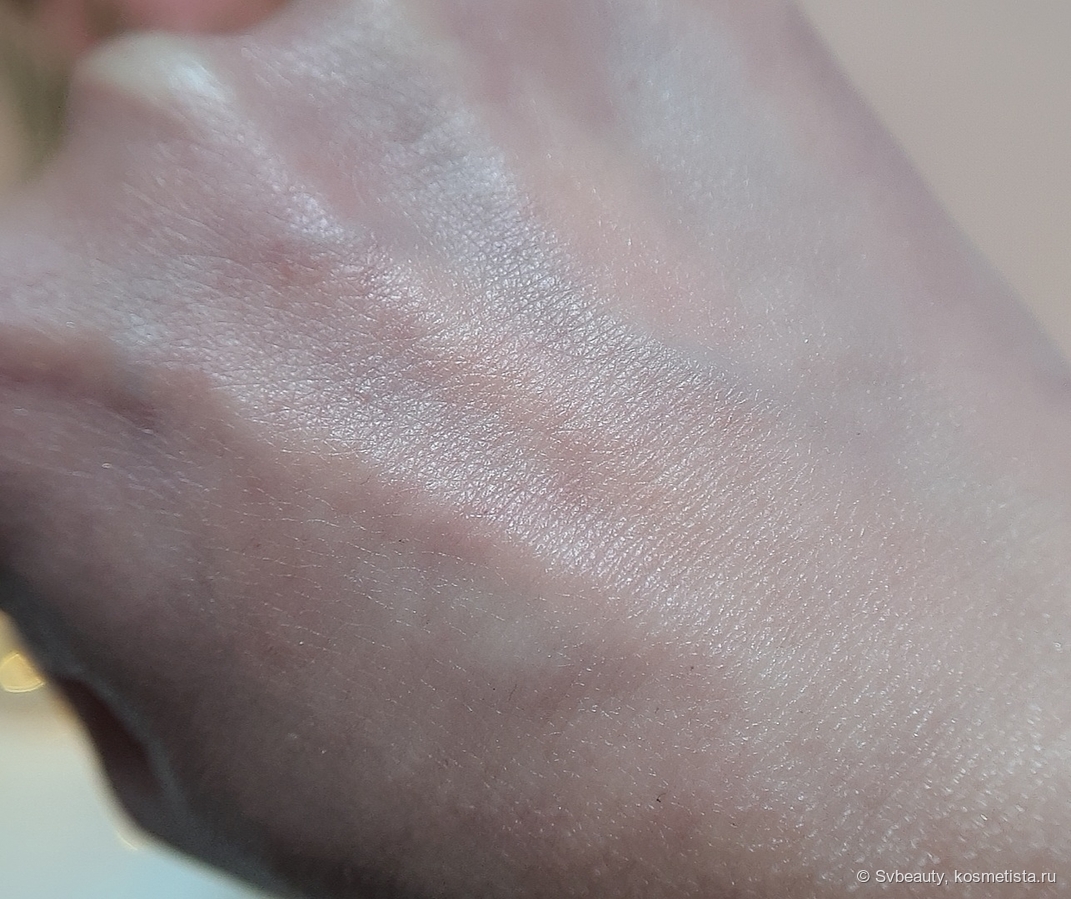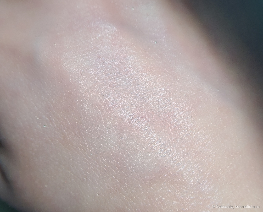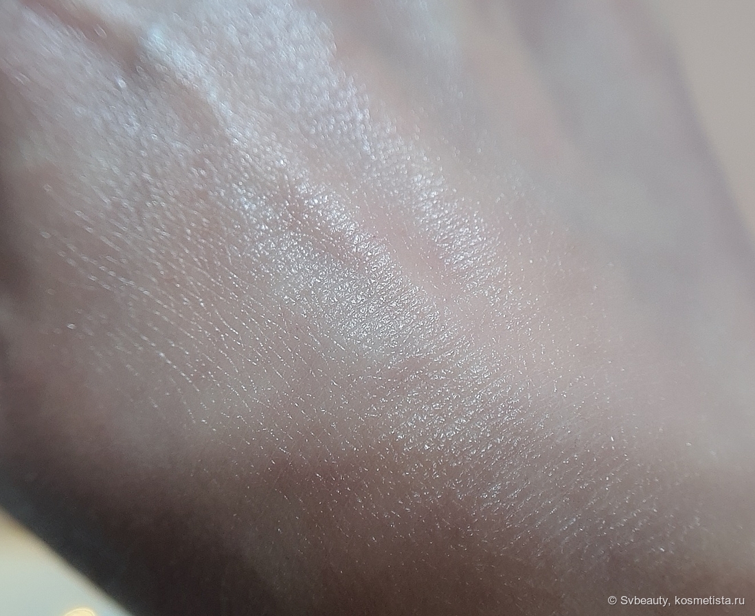 Эмульсия придаёт коже нежное сияние. Она мягко подсвечивает её. И вот тут, если внимательно присмотреться к коже после того, как нанесла на нее эмульсию, то можно заметить очень мелкие блёстки. Честно говоря, они настолько мелкие, что я их не сразу заметила.
