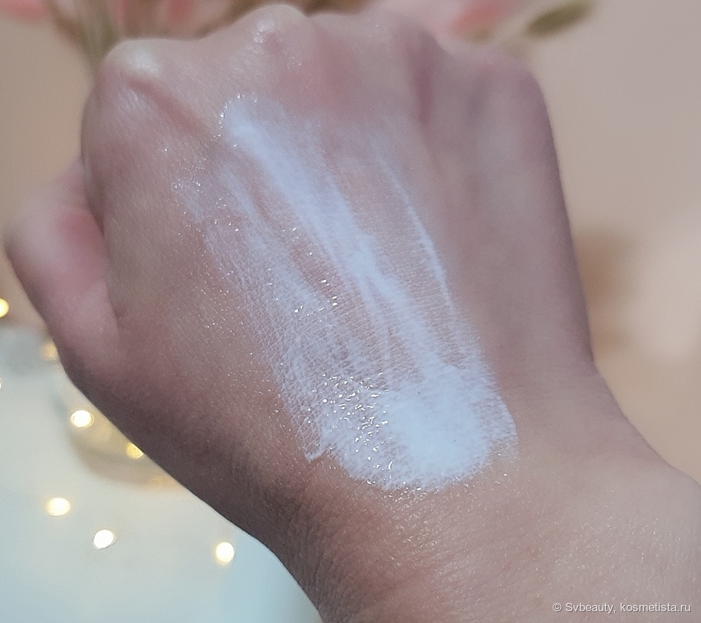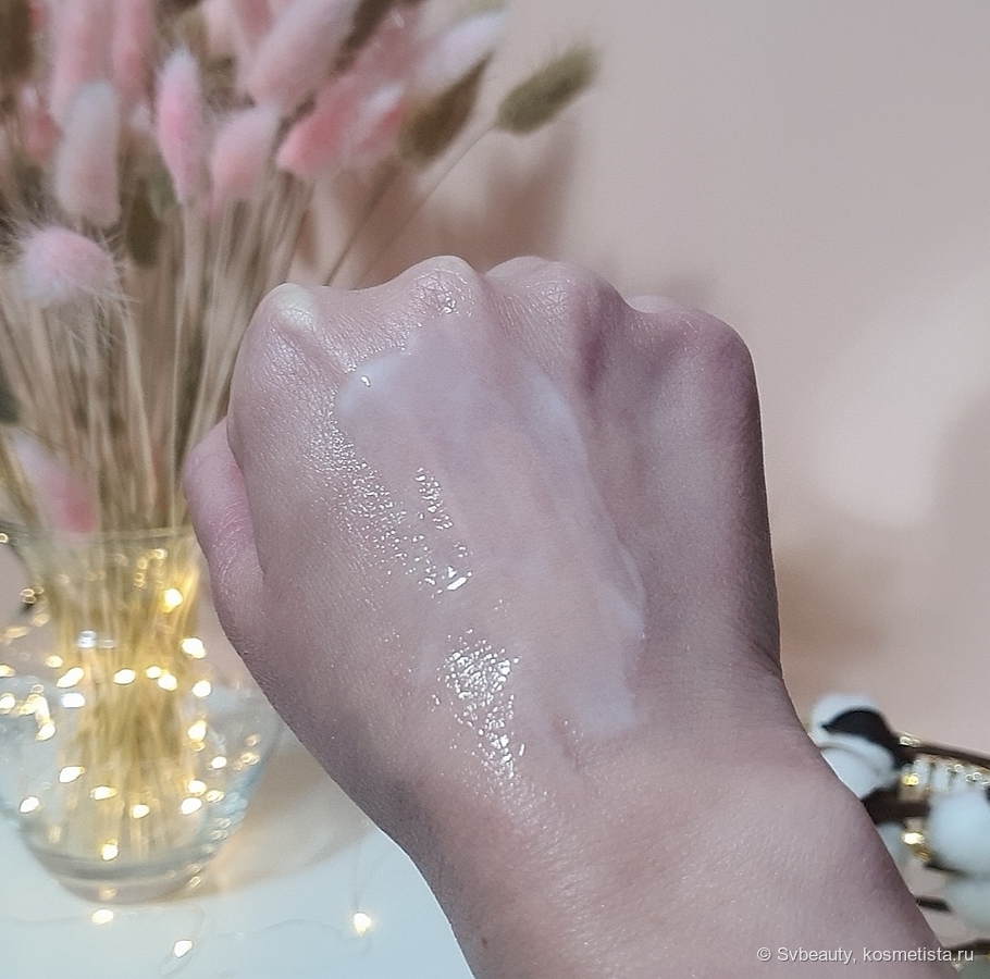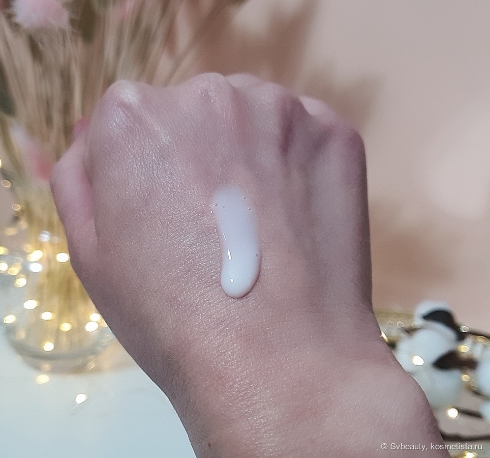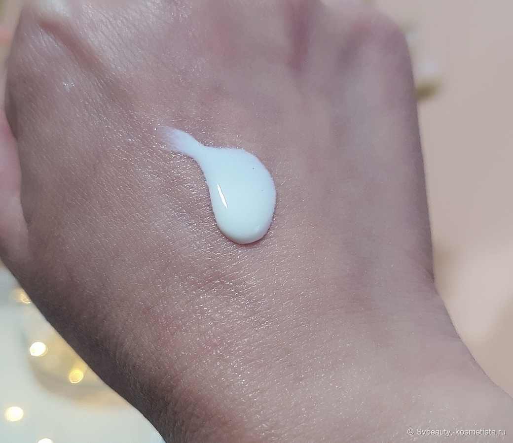 Эмульсия придаёт коже нежное сияние. Она мягко подсвечивает её. И вот тут, если внимательно присмотреться к коже после того, как нанесла на нее эмульсию, то можно заметить очень мелкие блёстки. Честно говоря, они настолько мелкие, что я их не сразу заметила.