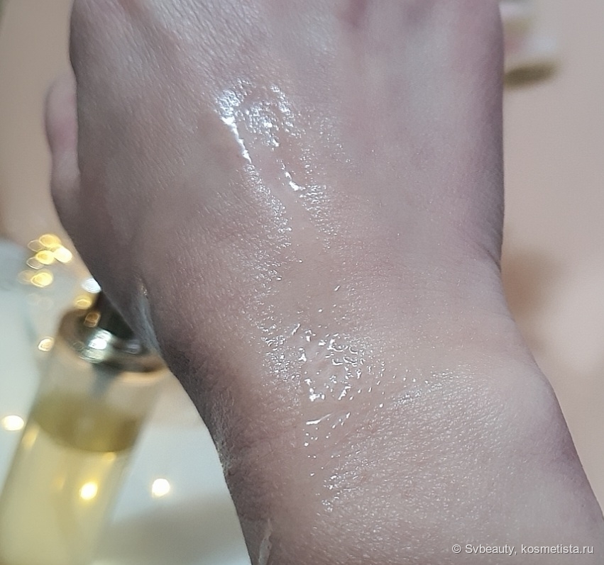 По ощущениям он немного скользкий, но на коже ощущается комфортно. Легко распределяется и быстро впитывается, не оставляя липкости или других неприятных ощущений. Мне кажется, у лосьона лёгкий цветочный аромат, но он настолько тонкий, что едва уловим.