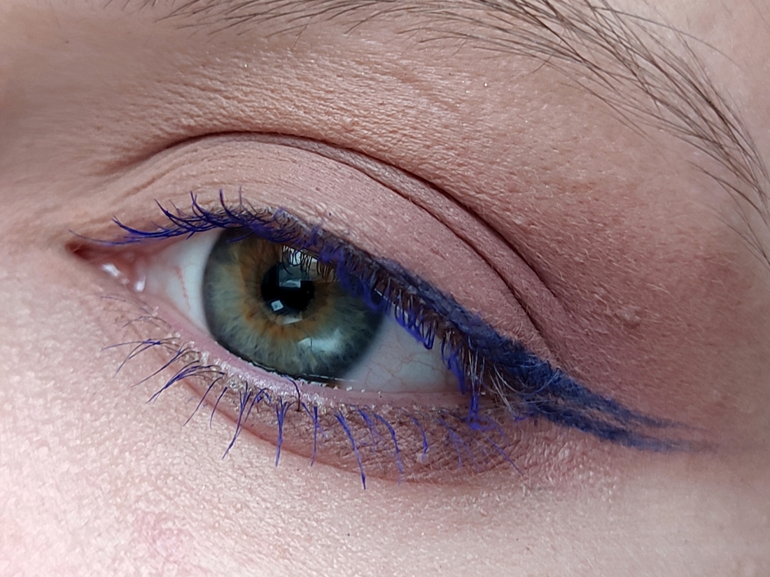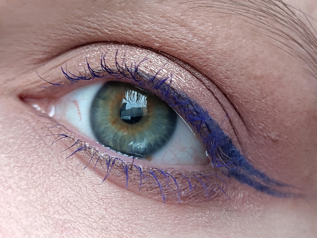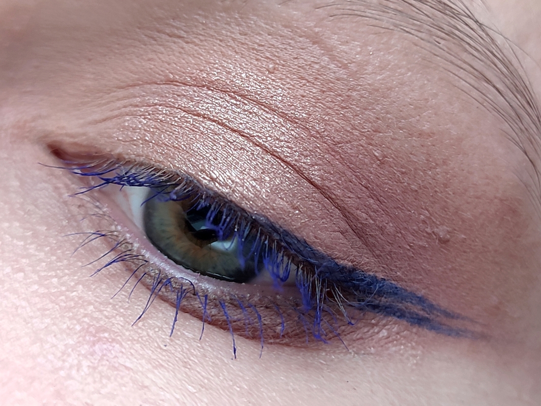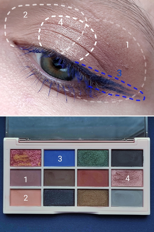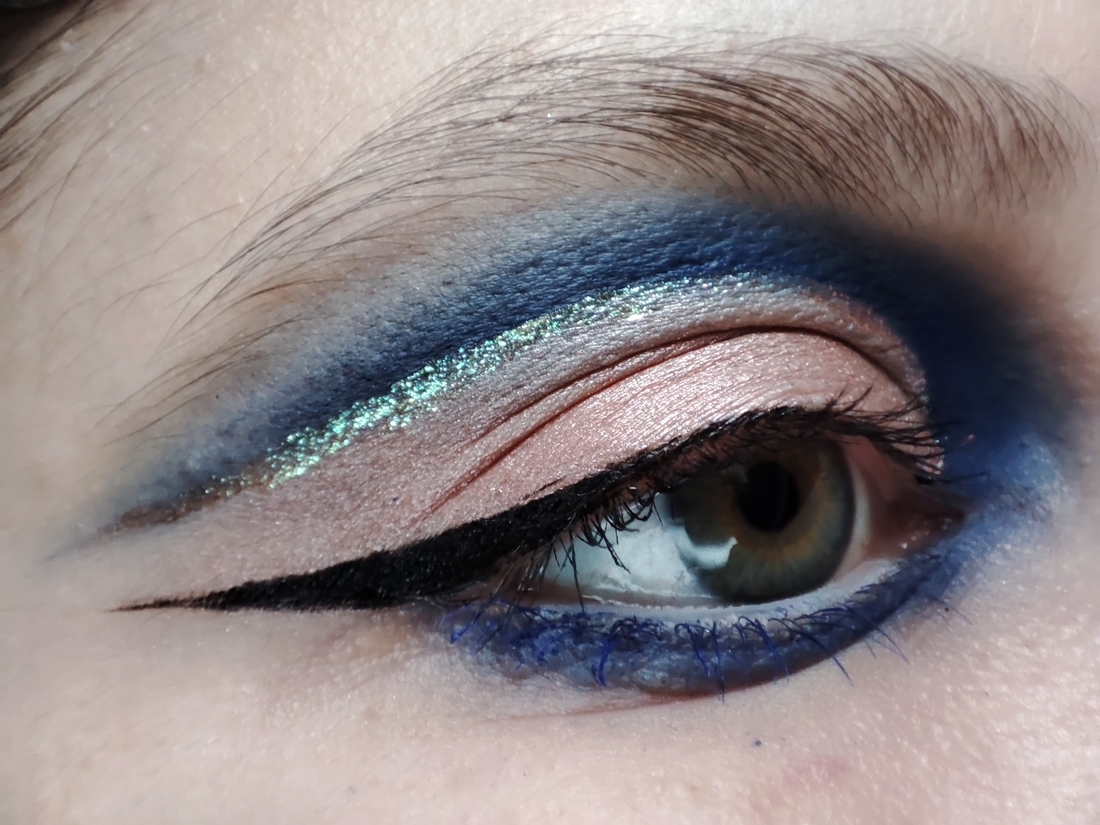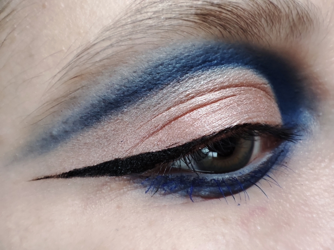 Подготовленное веко с базой. Розовое шампанское (номер 8) на подвижном веке. Синее недоразумение в графике и по нижнему веку. Почему недоразумение? Тут тушёвка — это не тушёвка, оттенок отказался тушеваться, с трудом наслаивался. А то, что вы видите, — это я ватной палочкой и тонкой кисточкой пыталась ту самую тушевку изобразить и убрать грязь.