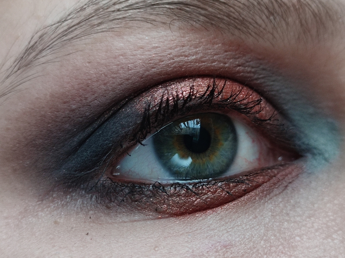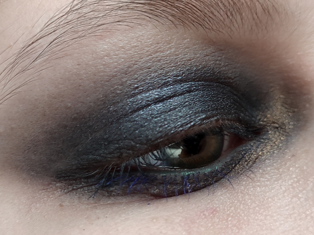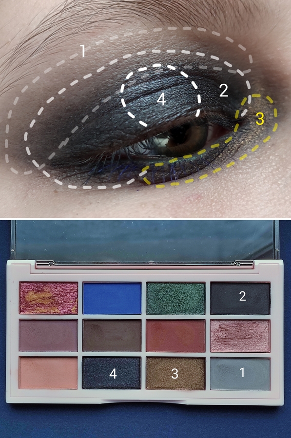 А все потому, что растушевать без базы матовые это целый квест. Условно темные матовые и темный матовый работают отвратительно: проваливаются в поры и получается грязь, точечки грязи. И исправить это почти невозможно. Оттенки плавно не тушуются. А если почистить палочкой все, что провалилось, и попробовать растушевать снова — не получится плавного перехода: граница нового и старого будет видна. Новая попытка, скорее всего, приведет снова к проваливанию теней в поры. Светлые матовые тут не помогут: они не смешиваются с уже нанесенными темными и как слетают с них. Синий ещё и осыпится, добавив масла в огонь. Да и убрать огрехи палочкой — надо постараться, потереть. Ей богу, пока этим всем накрасишься свет уже покинет улицу. Такой вот хоррор. Нет, психологический триллер! На базе все работает, вроде как, хорошо.