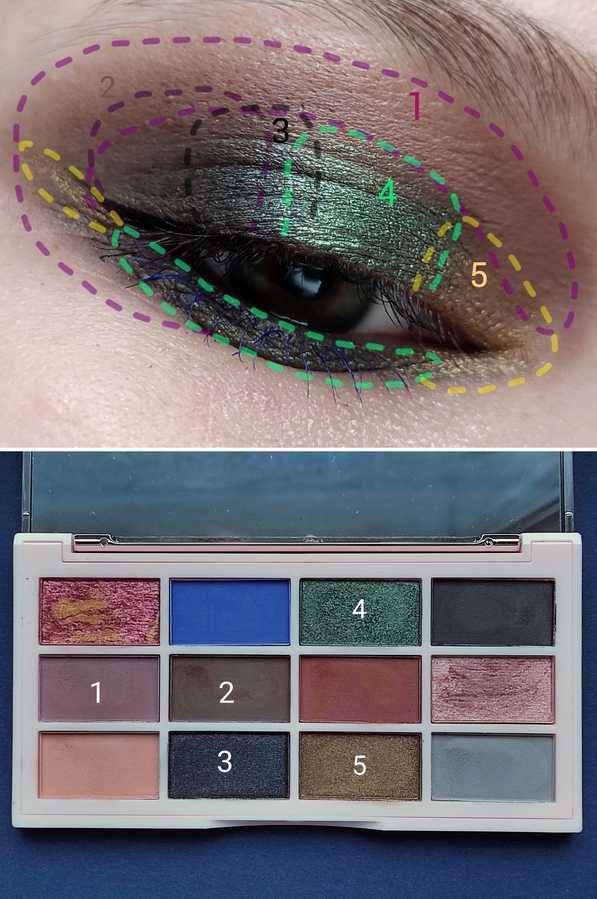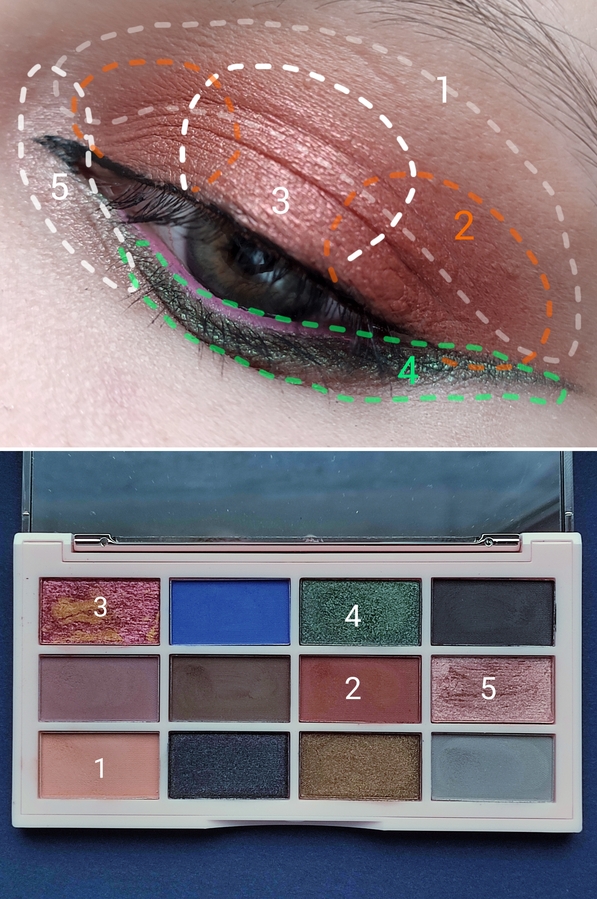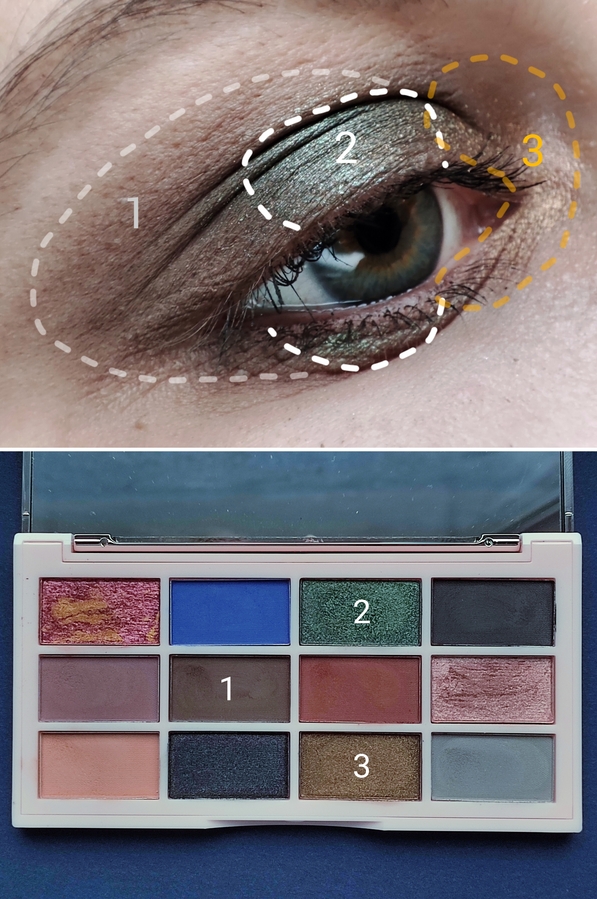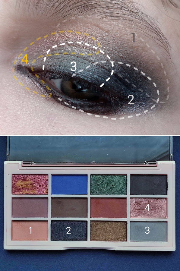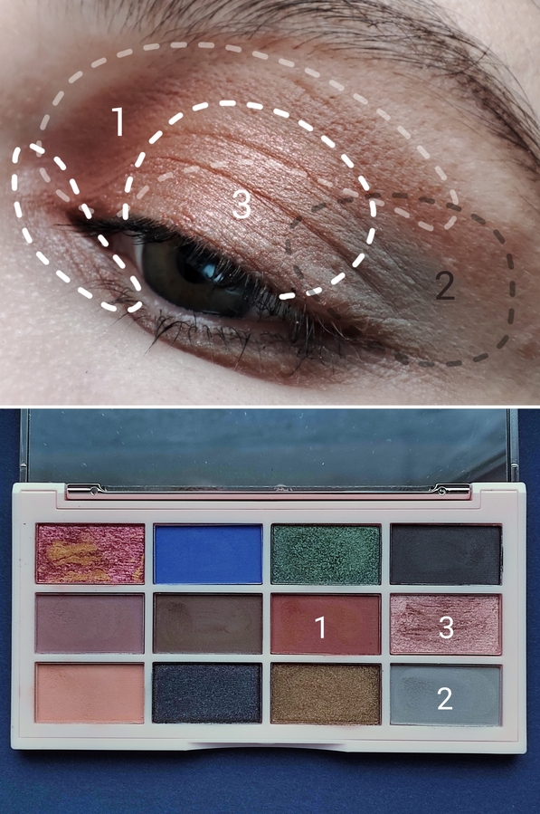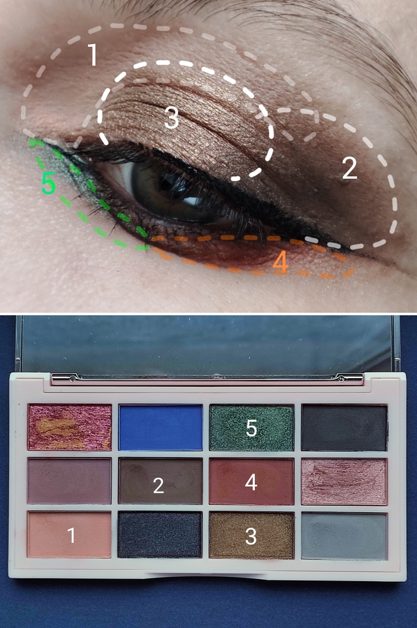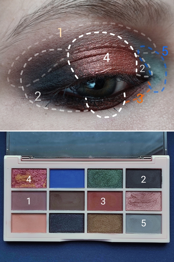 Тут я ещё не нашла подход к палетке и сделала макияж привычным для себя способом. Без базы, пытаясь аккуратно увести темный матовый в кожу.