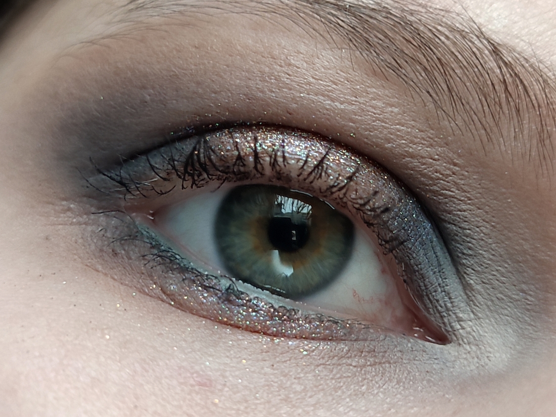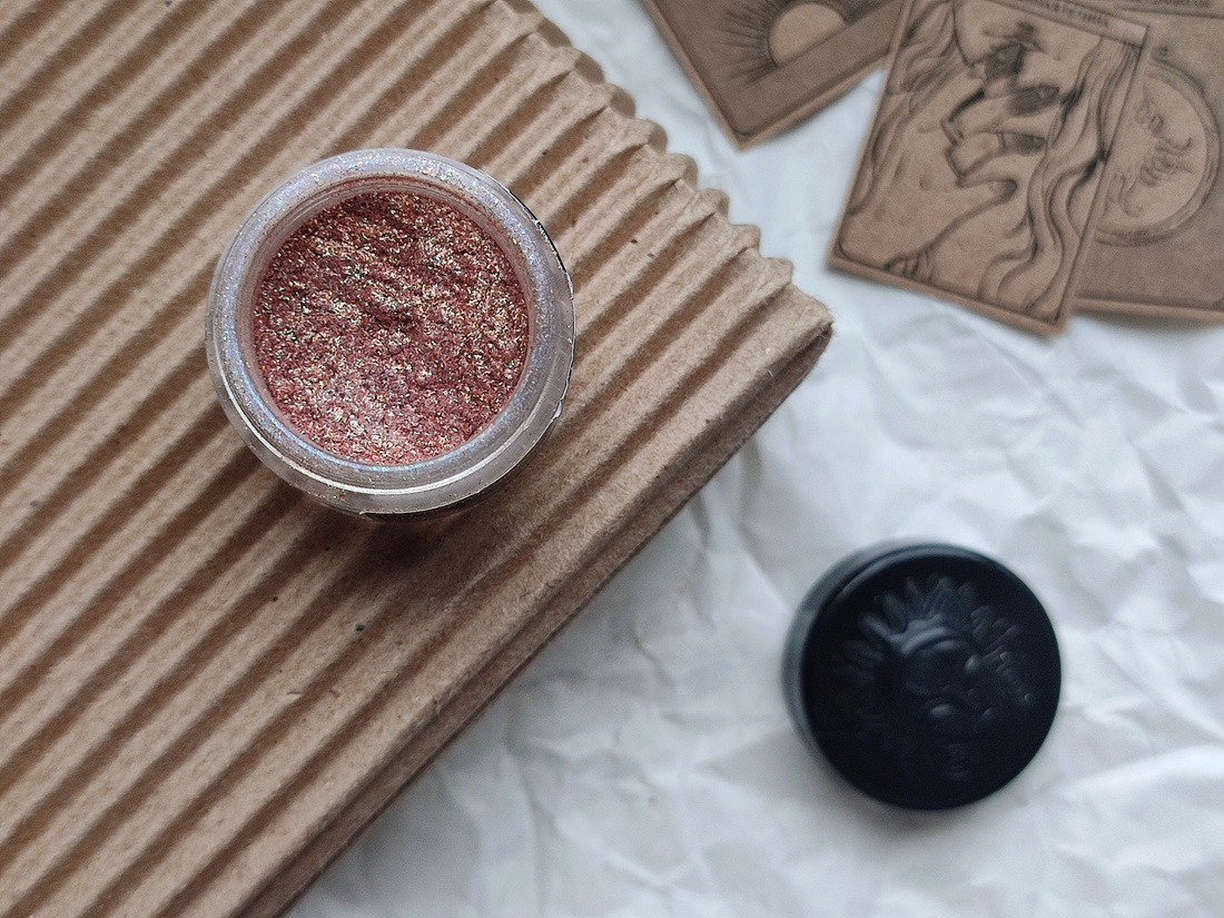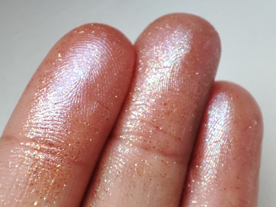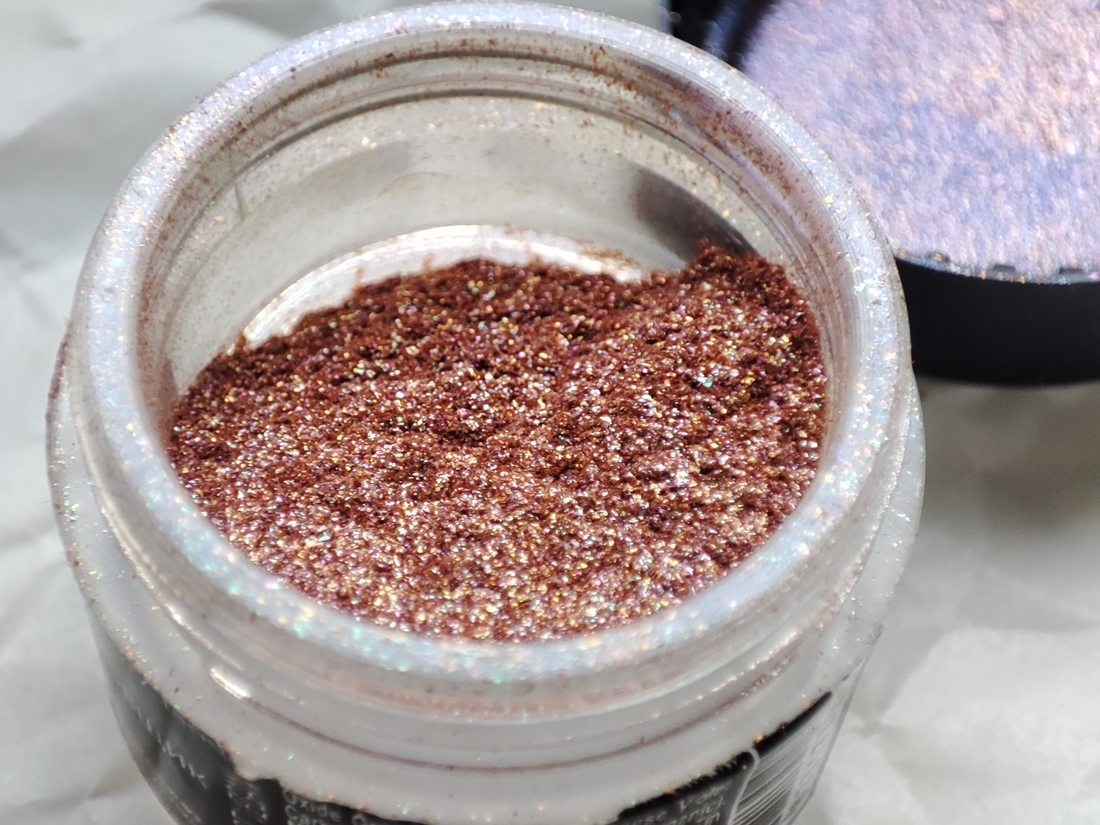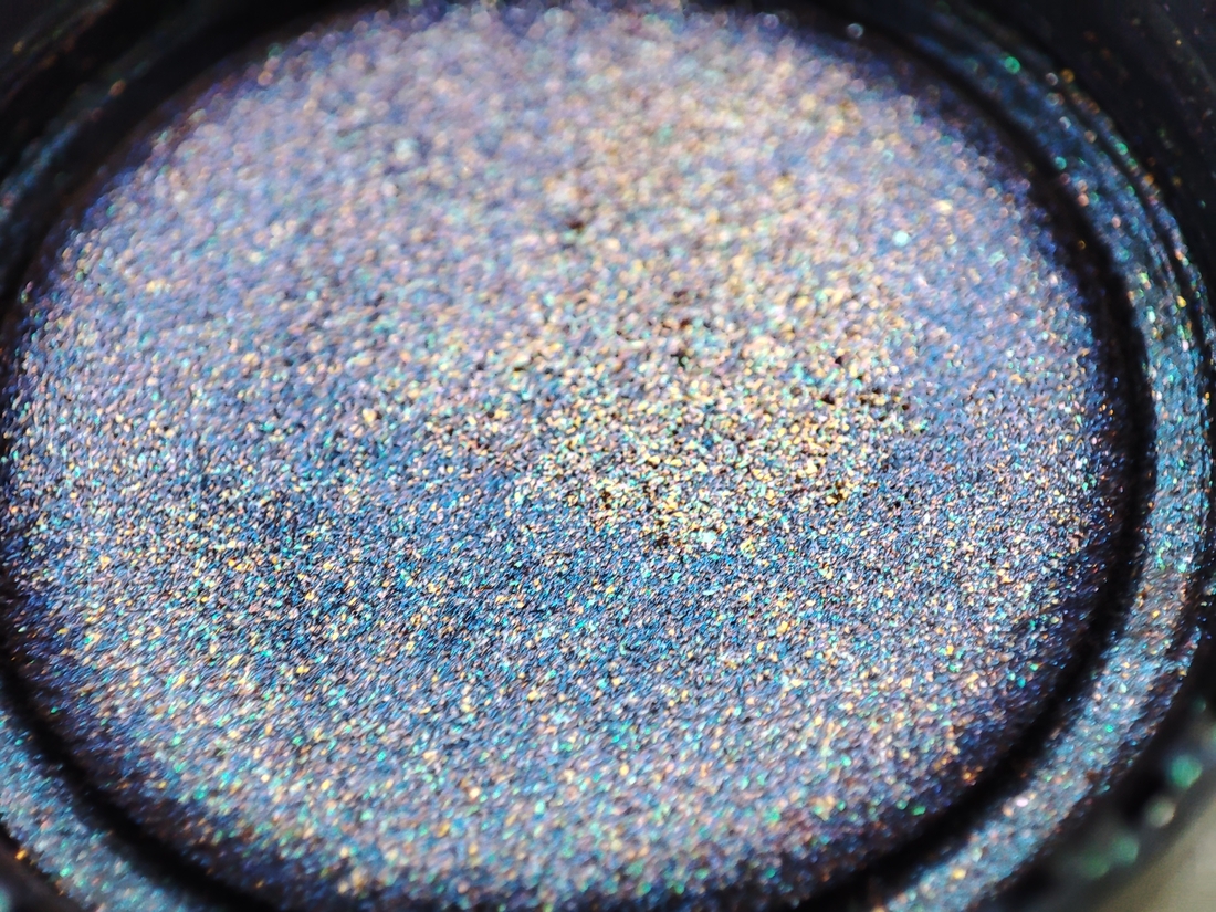 Текстура сухая. Это множество мелких блесточек. Не жестких. Глаза от них не болят. Оттенок подходит для набивки, в тушевку он не годится — разлетится по всему пространству вокруг, включая лицо. Но только посмотрите, как он искрится.