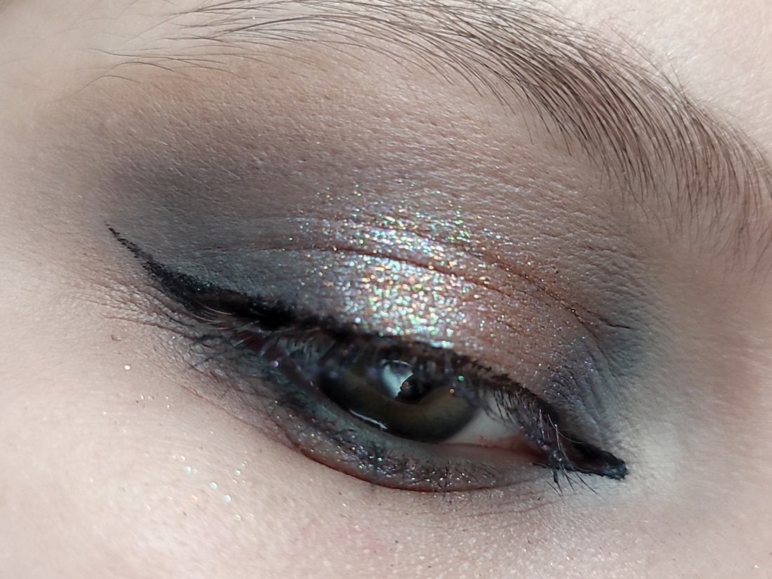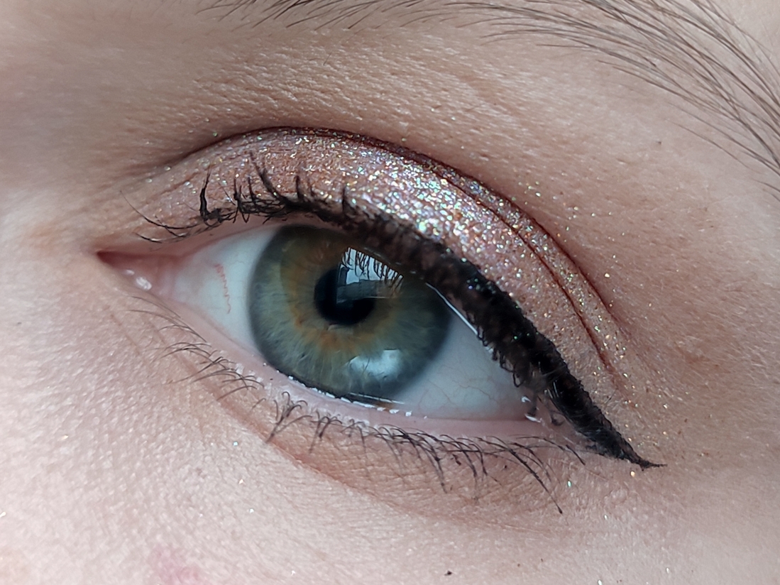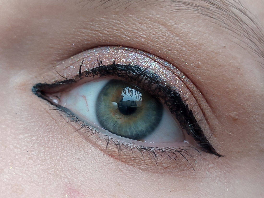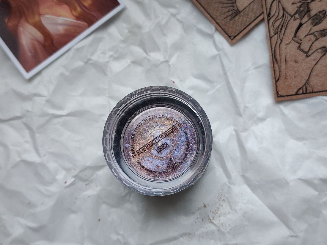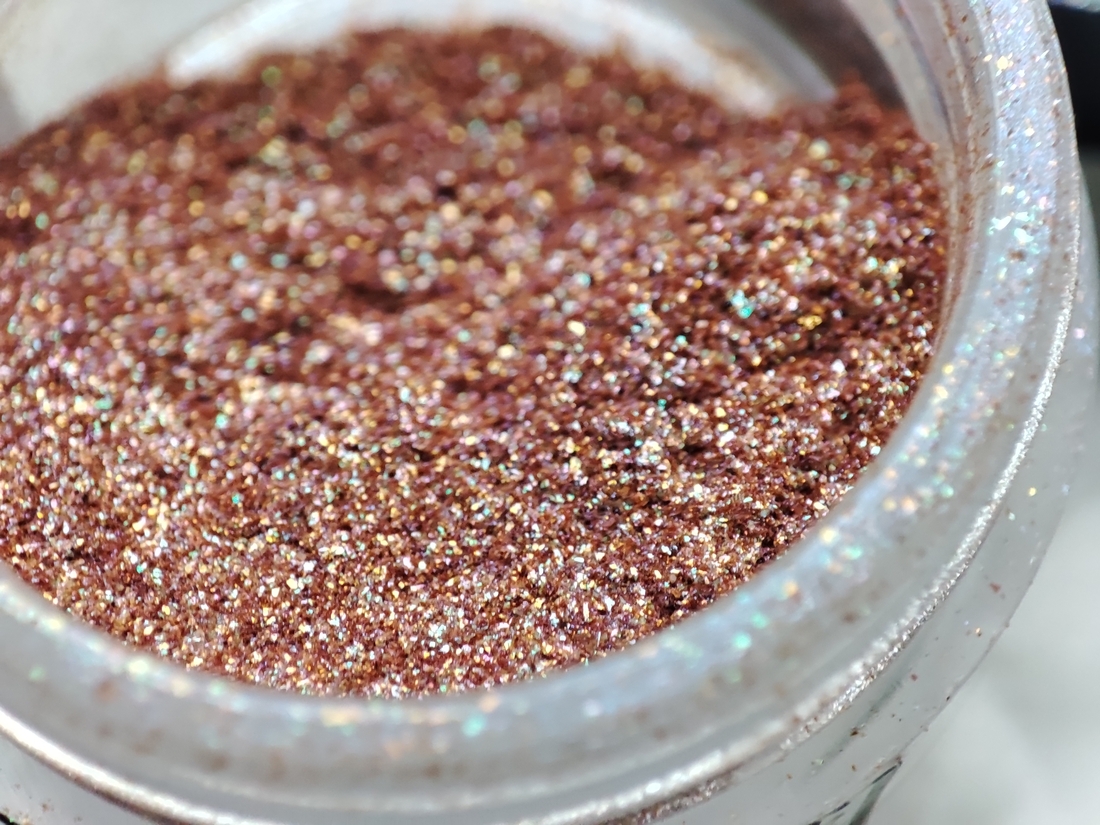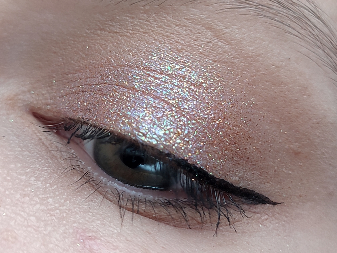 Текстура сухая. Это множество мелких блесточек. Не жестких. Глаза от них не болят. Оттенок подходит для набивки, в тушевку он не годится — разлетится по всему пространству вокруг, включая лицо. Но только посмотрите, как он искрится.