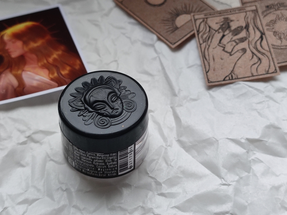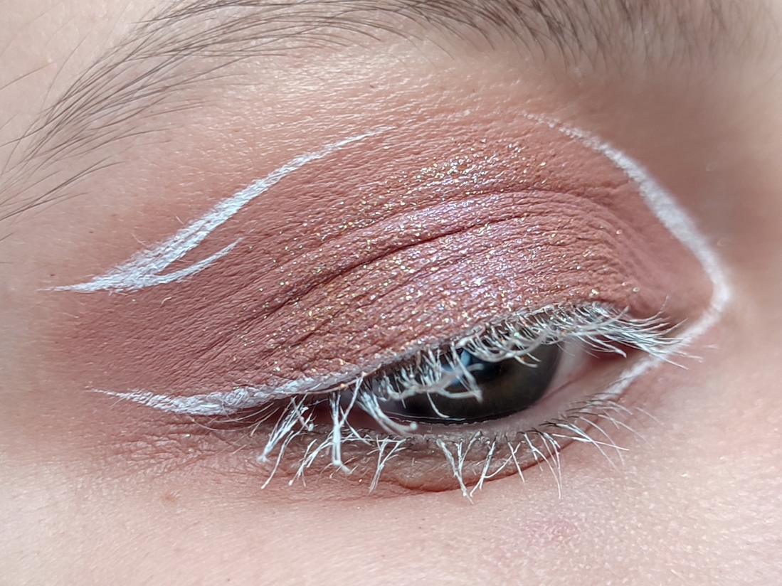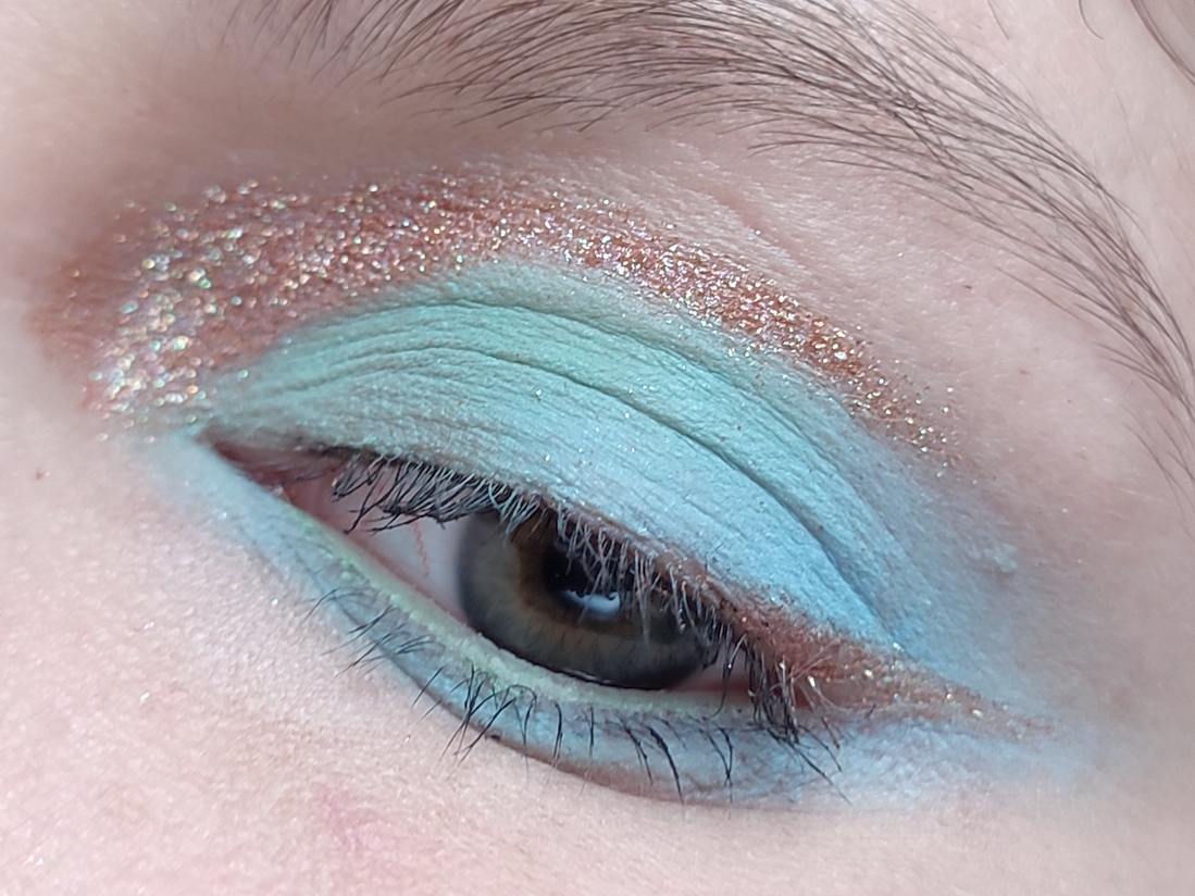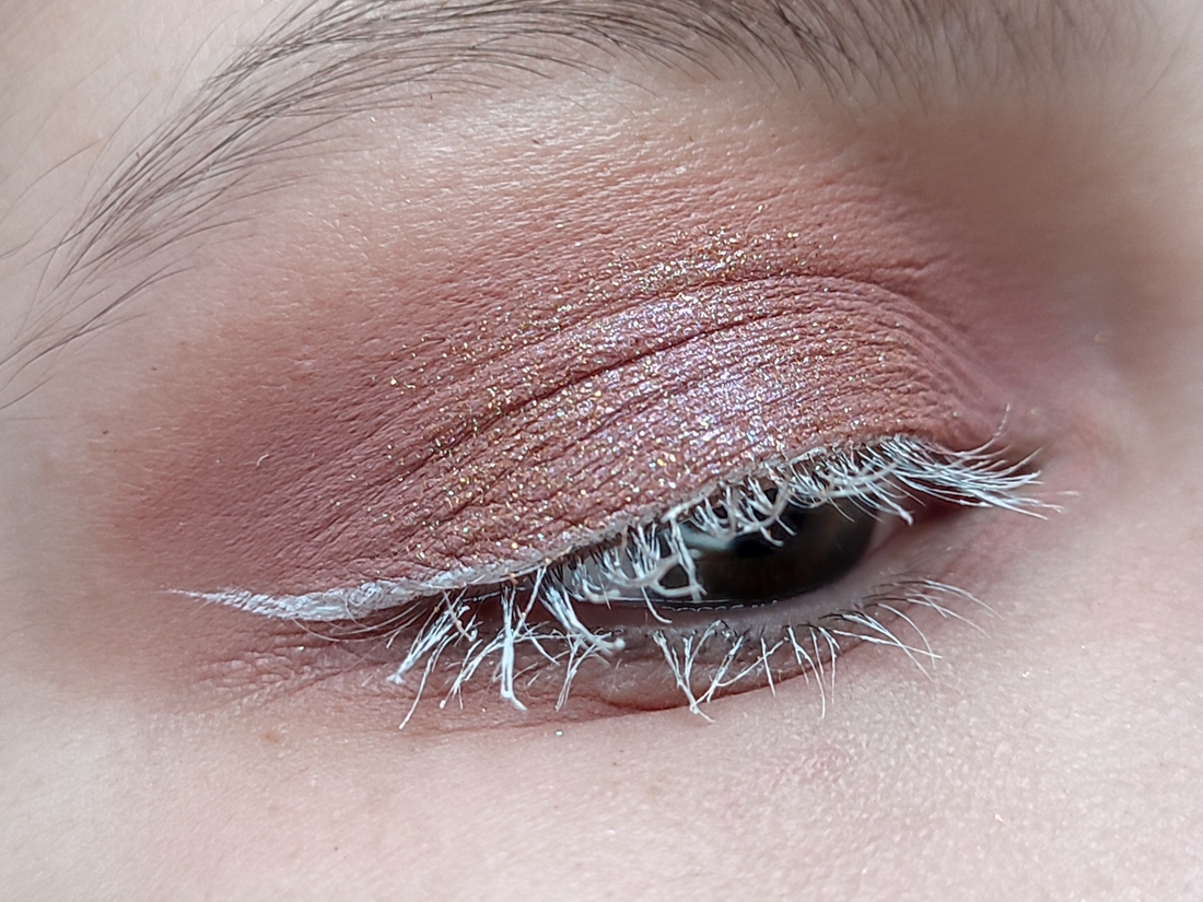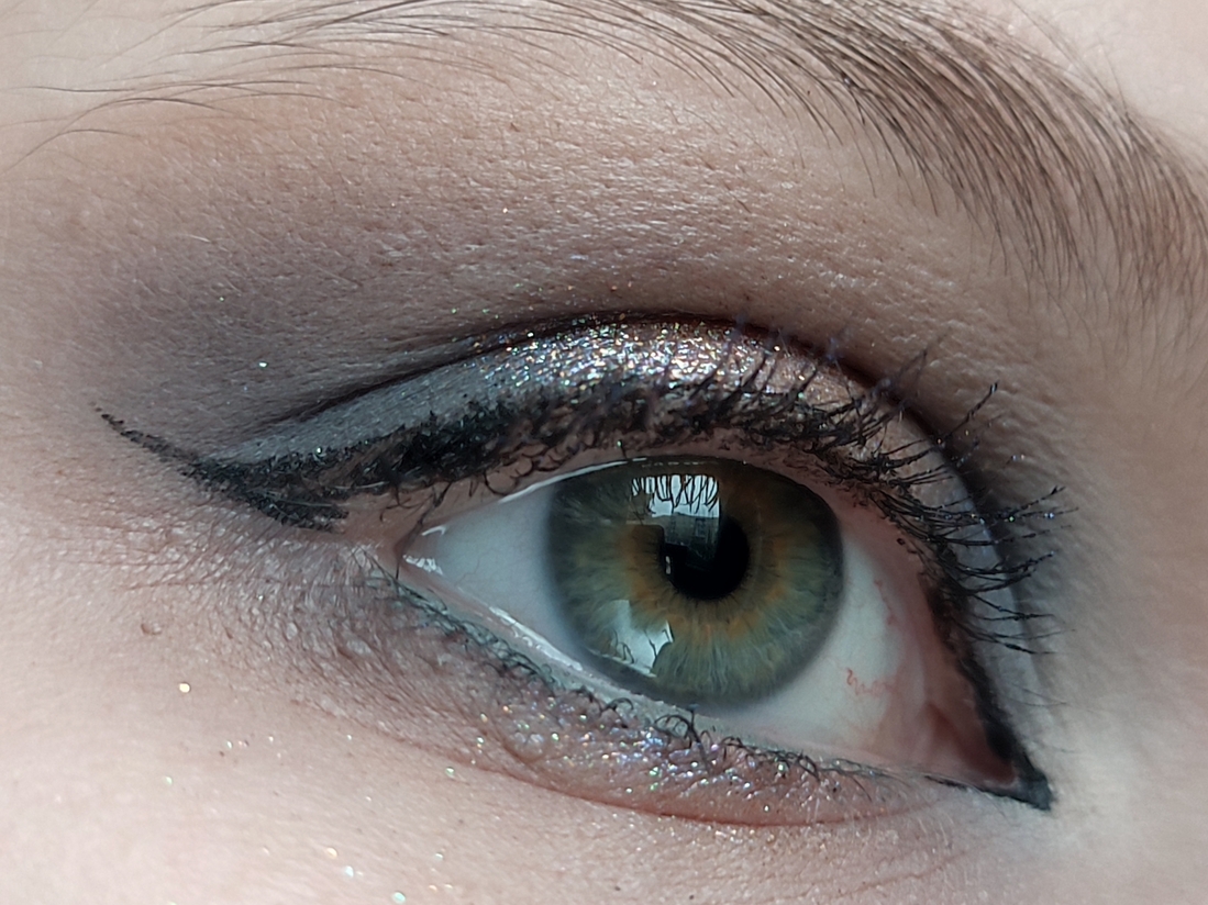 Текстура сухая. Это множество мелких блесточек. Не жестких. Глаза от них не болят. Оттенок подходит для набивки, в тушевку он не годится — разлетится по всему пространству вокруг, включая лицо. Но только посмотрите, как он искрится.
