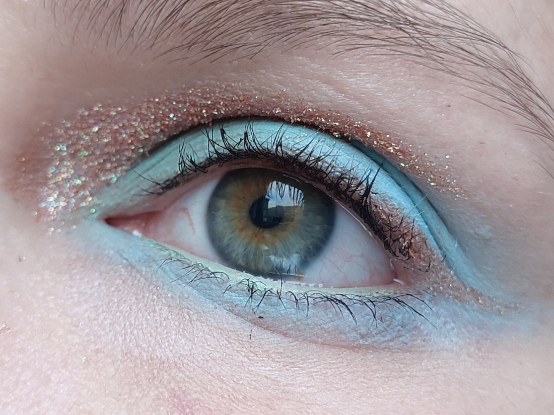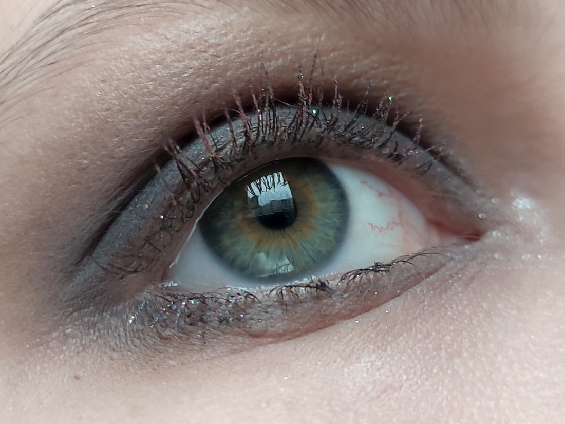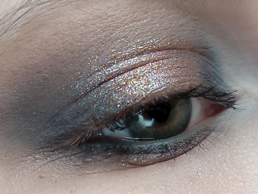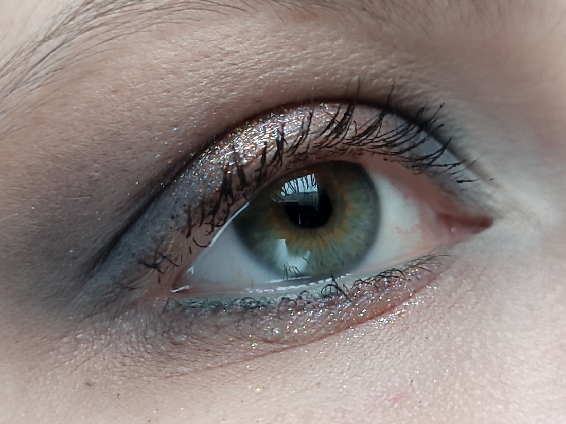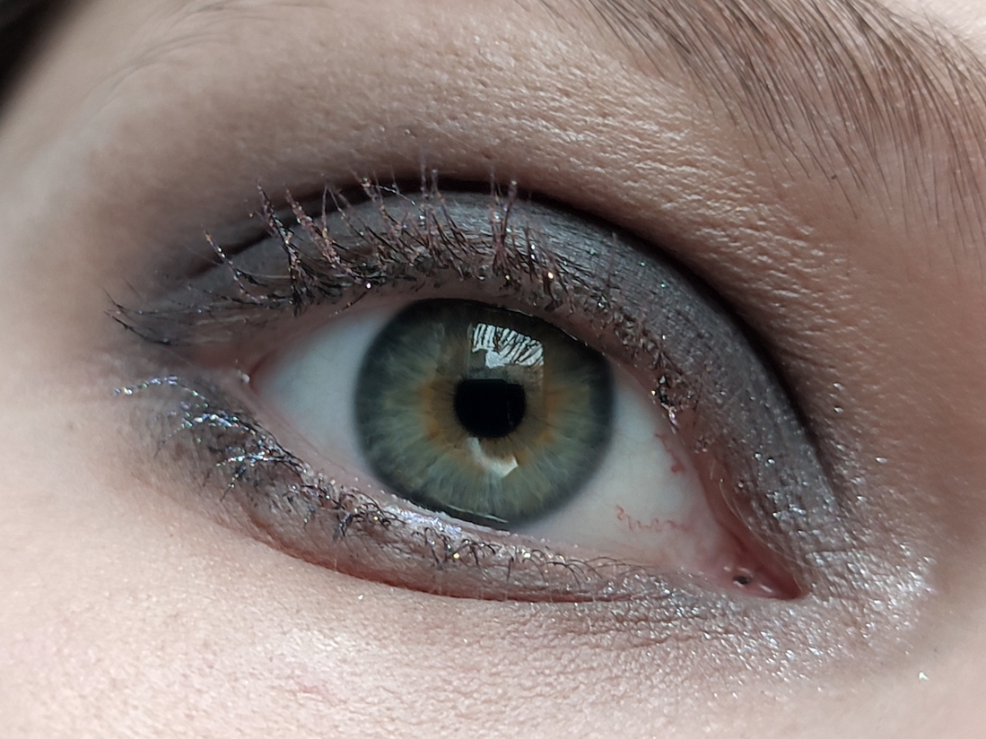 Камера, конечно, съедает половину того, что я вижу в зеркале. Это очень красиво! Оттенок одновременно понятный и сложный. Один существенный минус — не каждому подойдёт формат рассыпчатых теней. Вот это приклеивание и осыпания. Это не вариант «нанес и побежал». А скорее ритуал, свидание с собой или кем-нибудь ещё, предвкушение праздника. Сам праздник.