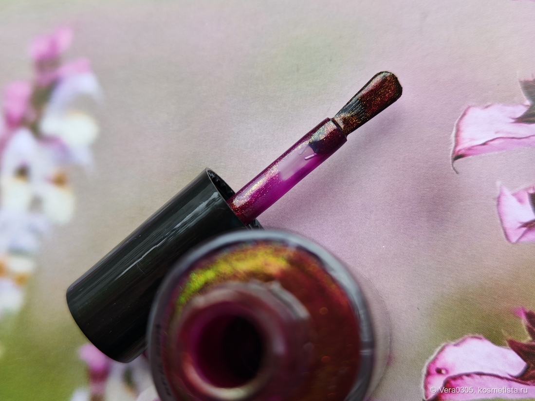 Сохнет лак небыстро, я в итоге не выдерживаю и покрываю топом-сушкой. Топ придает дополнительный глянец, что лаку только на пользу, свой финиш умеренно глянцевый, чуть в сторону сатинового.