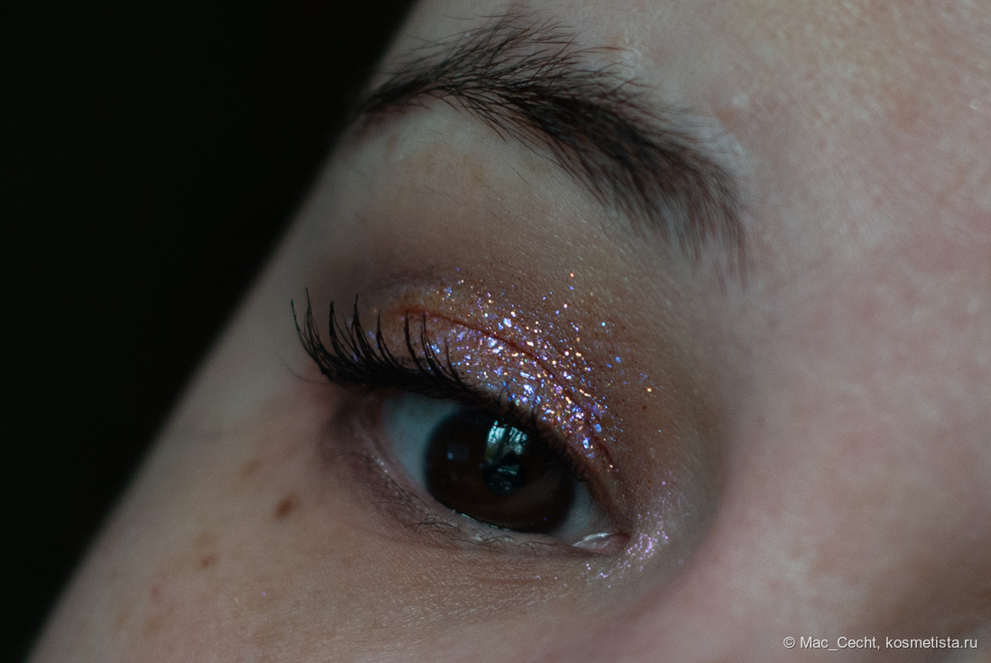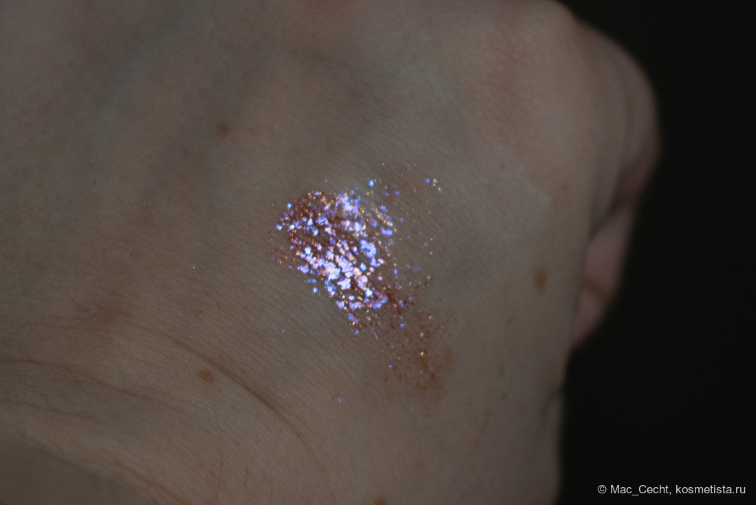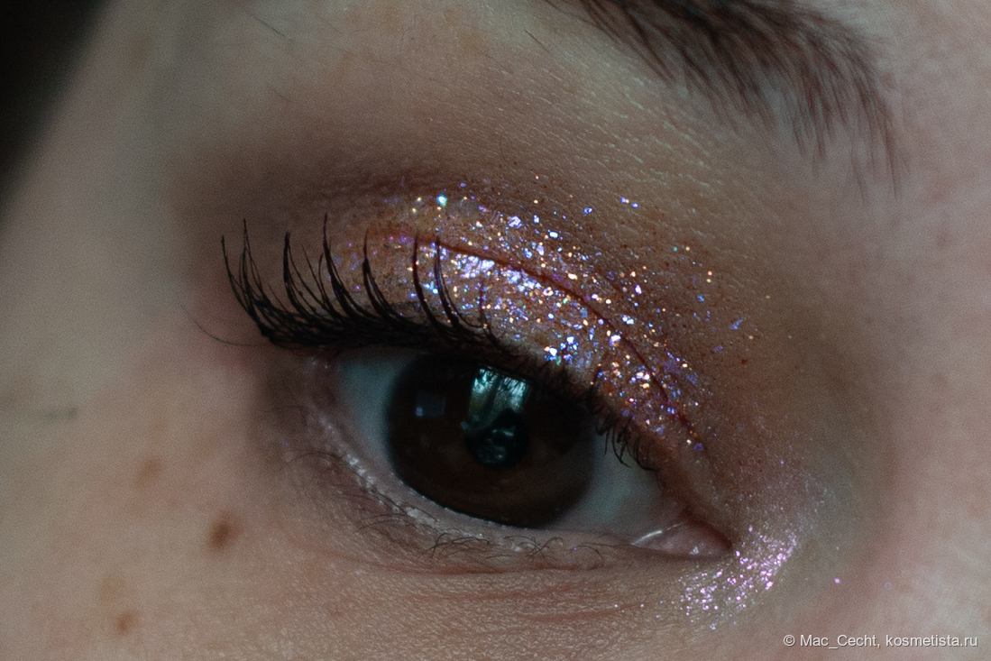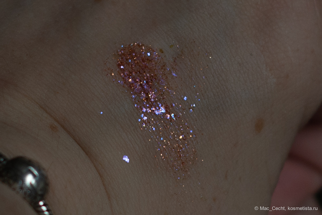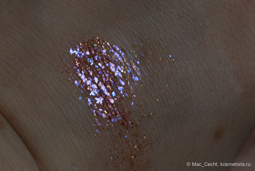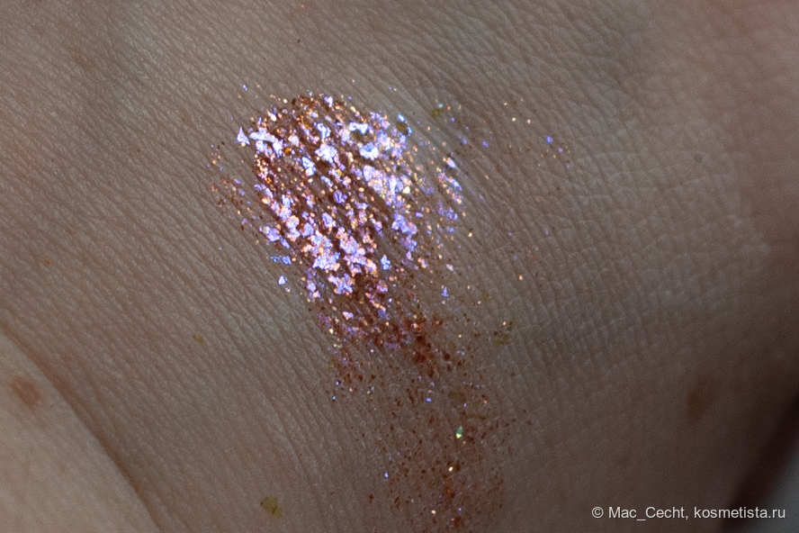 В итоге, там есть медные хлопья, но мало. И я бы сказала, что где-то слюда преломляется в медь, но, в целом, я вижу эти тени светло-розовыми, полупрозрачными, с большими хлопьями ярко бликующей слюды. Блик от голубого до розового и сиреневого. То есть общее впечатление от теней у меня — розово-сиреневые.