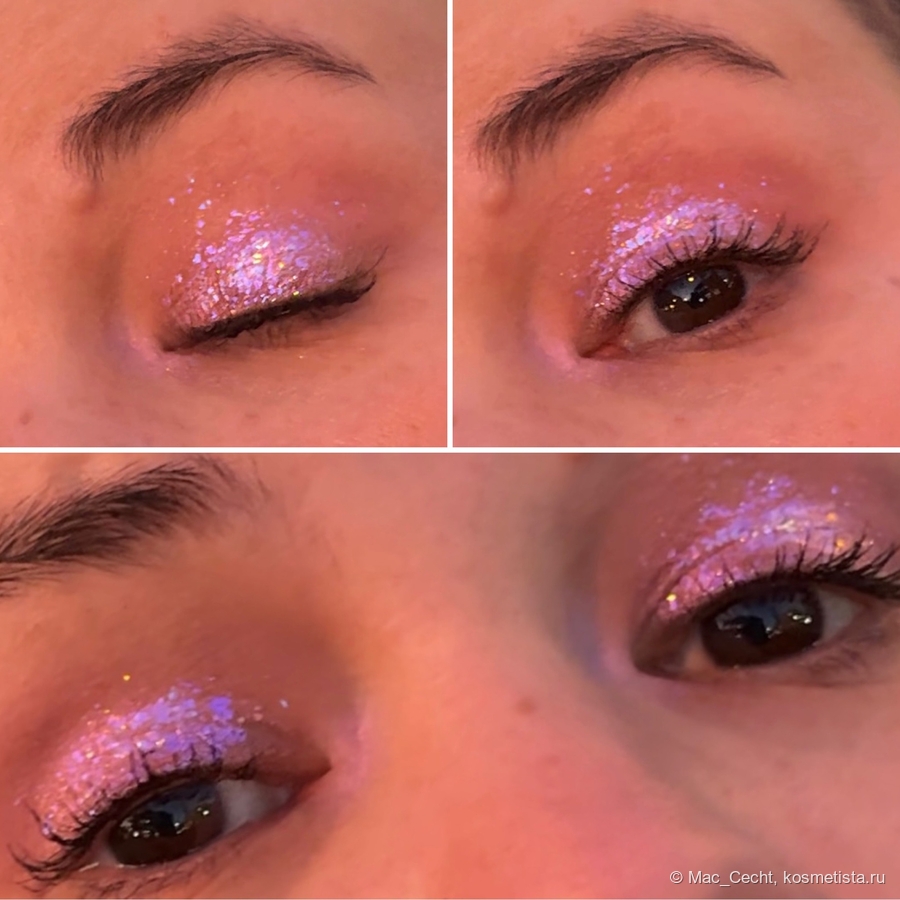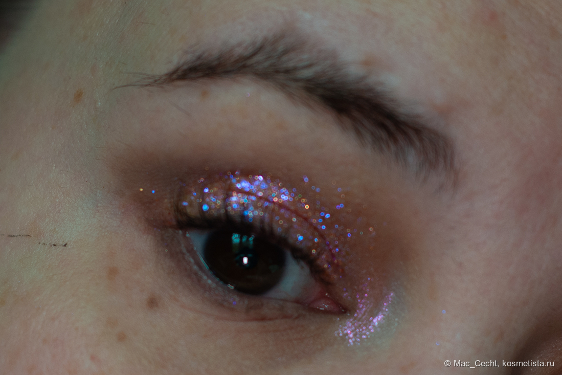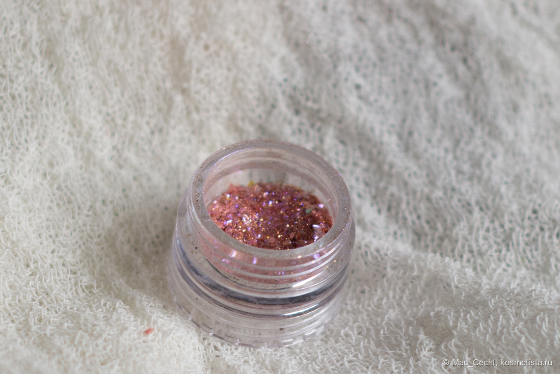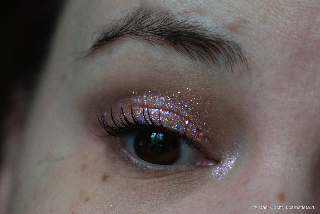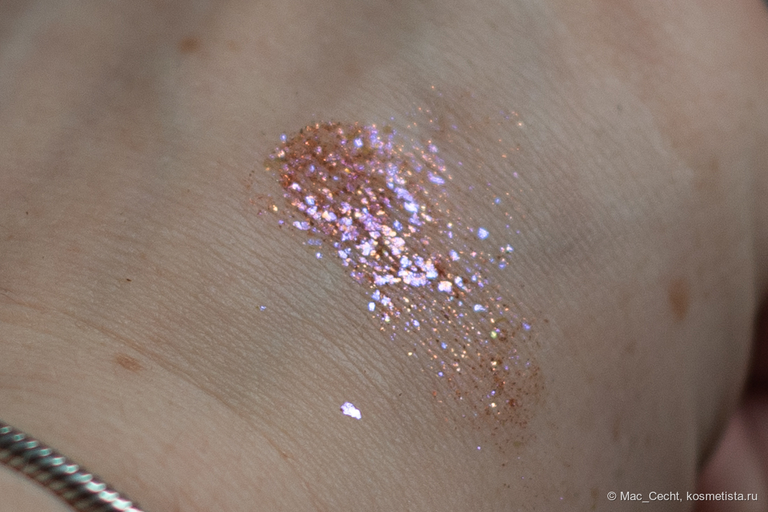 В итоге, там есть медные хлопья, но мало. И я бы сказала, что где-то слюда преломляется в медь, но, в целом, я вижу эти тени светло-розовыми, полупрозрачными, с большими хлопьями ярко бликующей слюды. Блик от голубого до розового и сиреневого. То есть общее впечатление от теней у меня — розово-сиреневые.