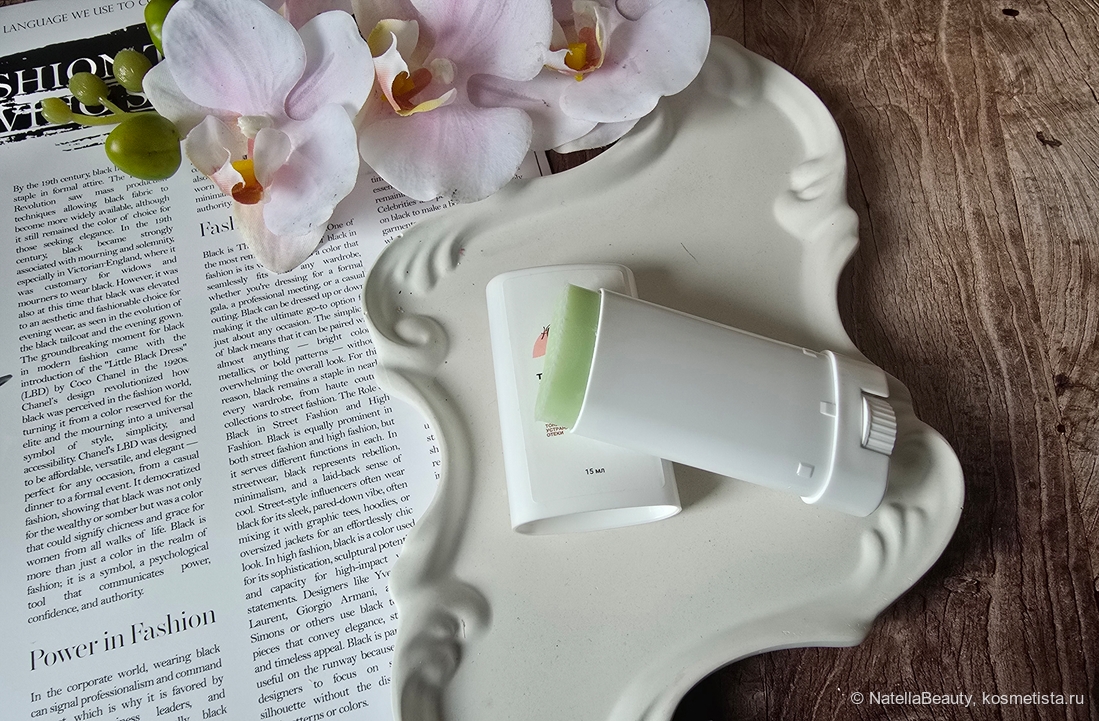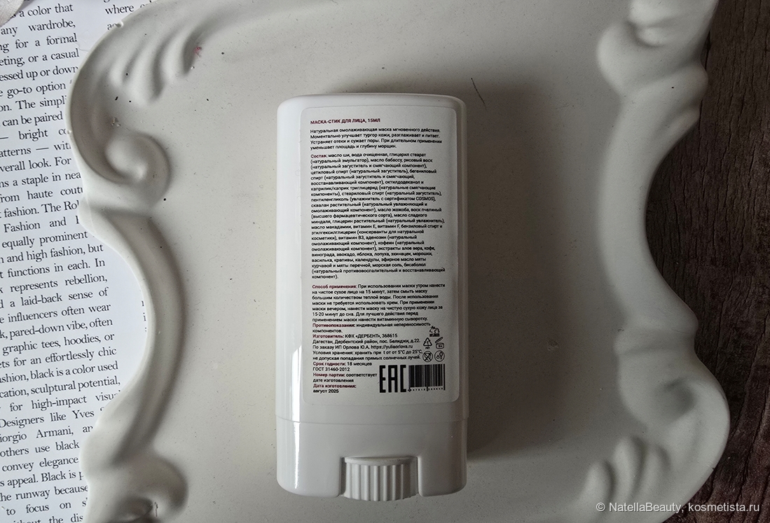 Упаковка простая и минималистическая, в форме стика. Корпус упаковки пластиковый, выполнен качественно. Снизу есть колесик, которым мы выкручиваем стик. Очень напоминает упаковки спф-средств. Такую маску удобно брать в поездки, она занимает очень мало места в сумочке.