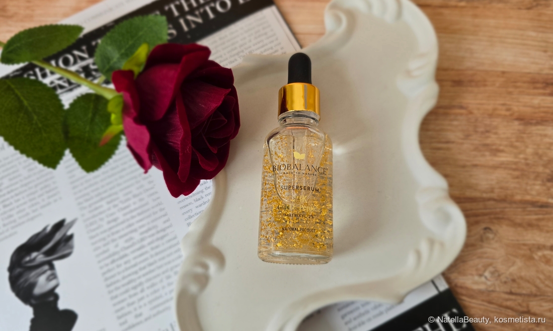 Я очень люблю всё красивое и блестящее, а если это ещё и эффективное, то цены нет такому продукту. Поэтому, когда я увидела сыворотку Biobalance 24k gold & peptide matrixyl 2% super serum с частичками золота, я загорелась её попробовать. И вот заветный флакончик у меня в руках.