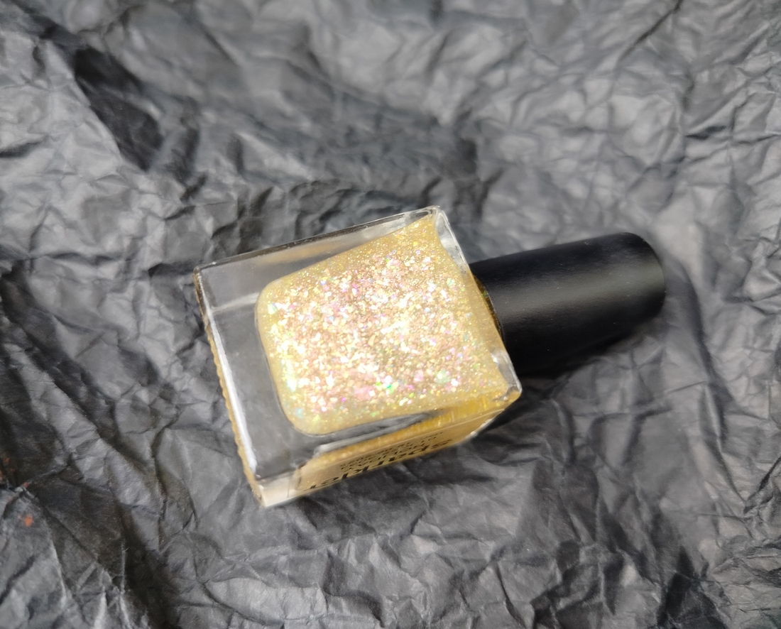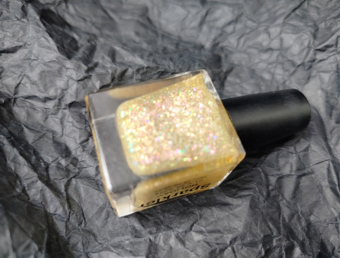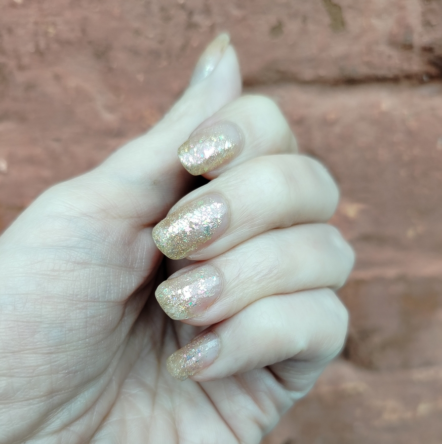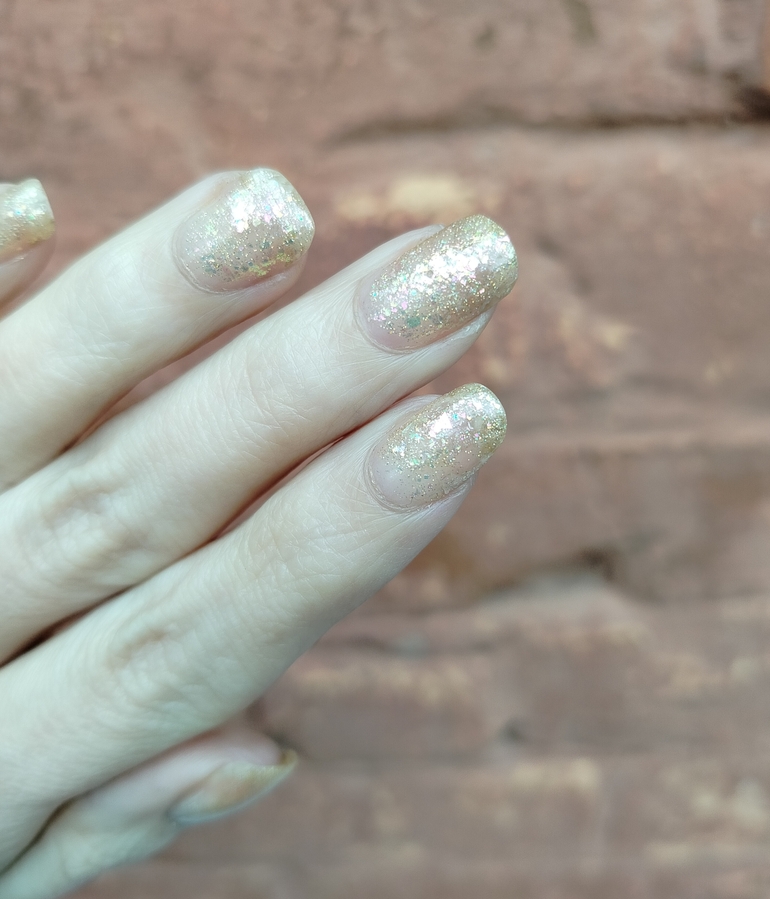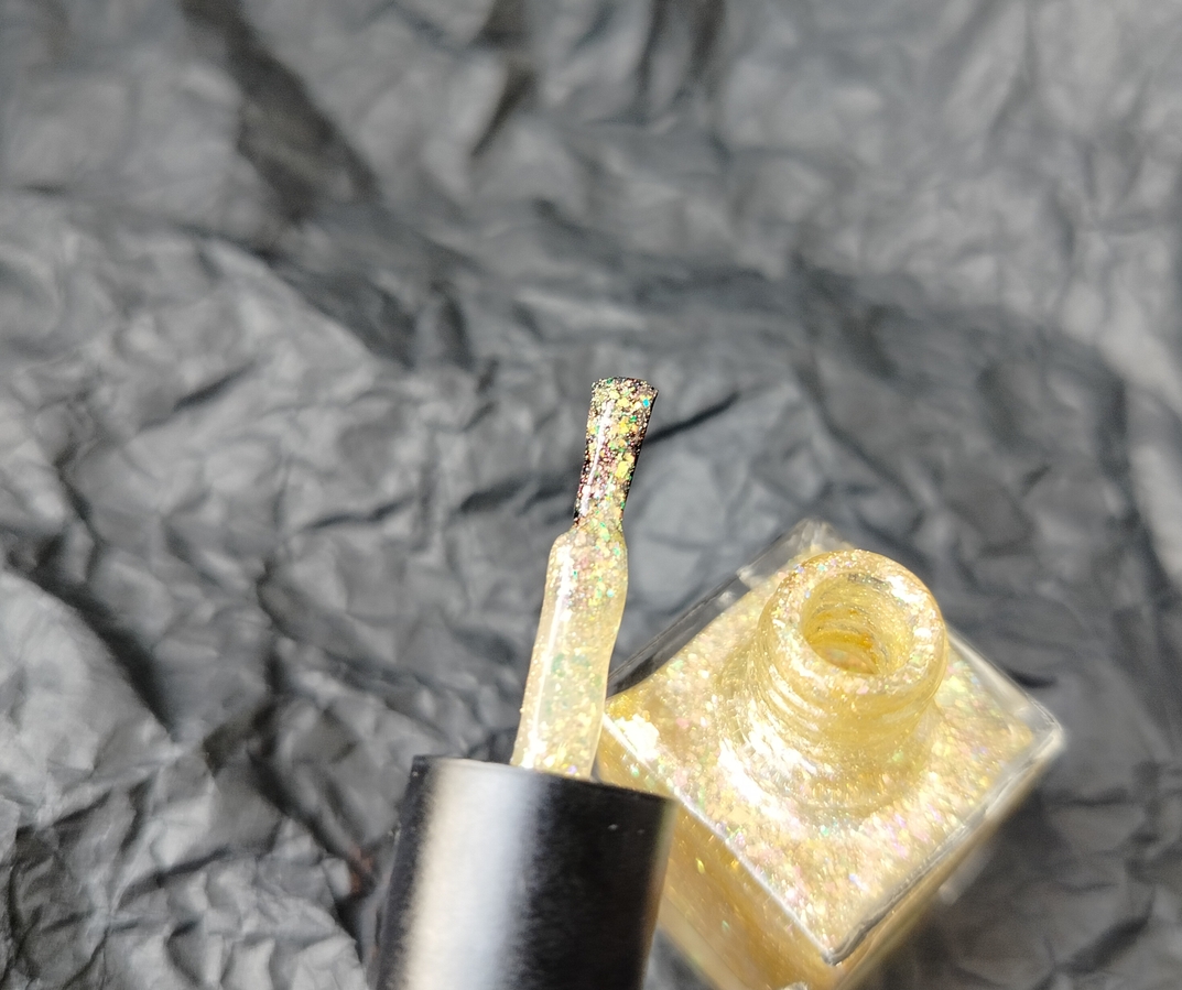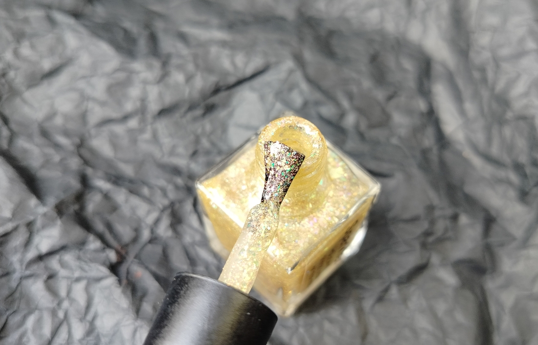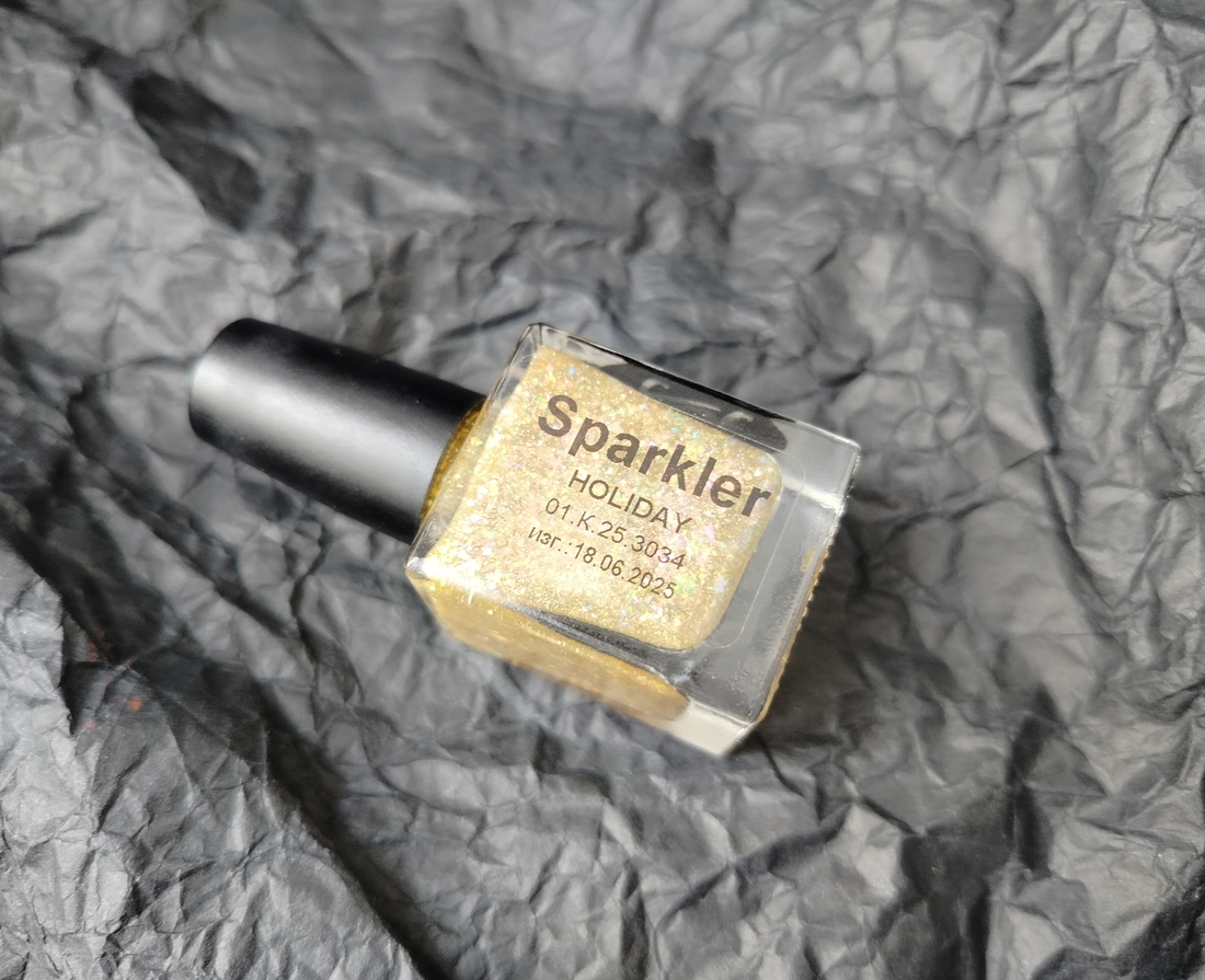 Оттенок Sparkler (Бенгальский огонь) — прозрачная, но достаточно плотная база с золотисто-зелено-розовой мультихромной слюдой, мелким золотым голографическим глиттером и радужным микроглиттером.