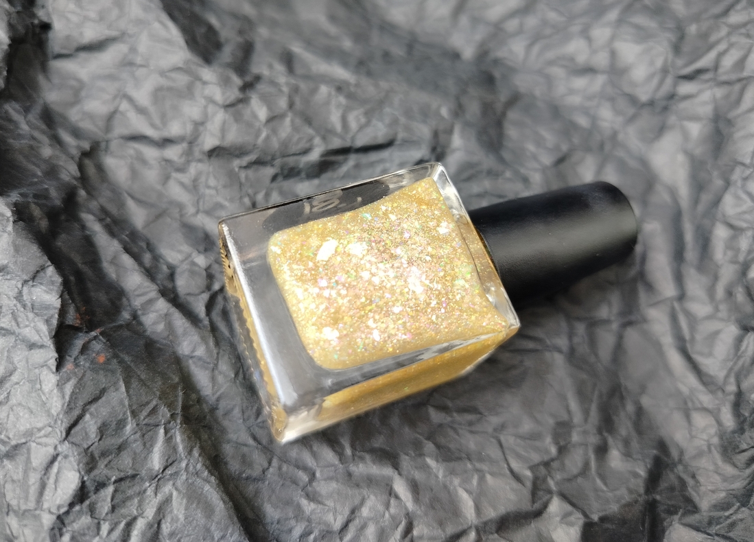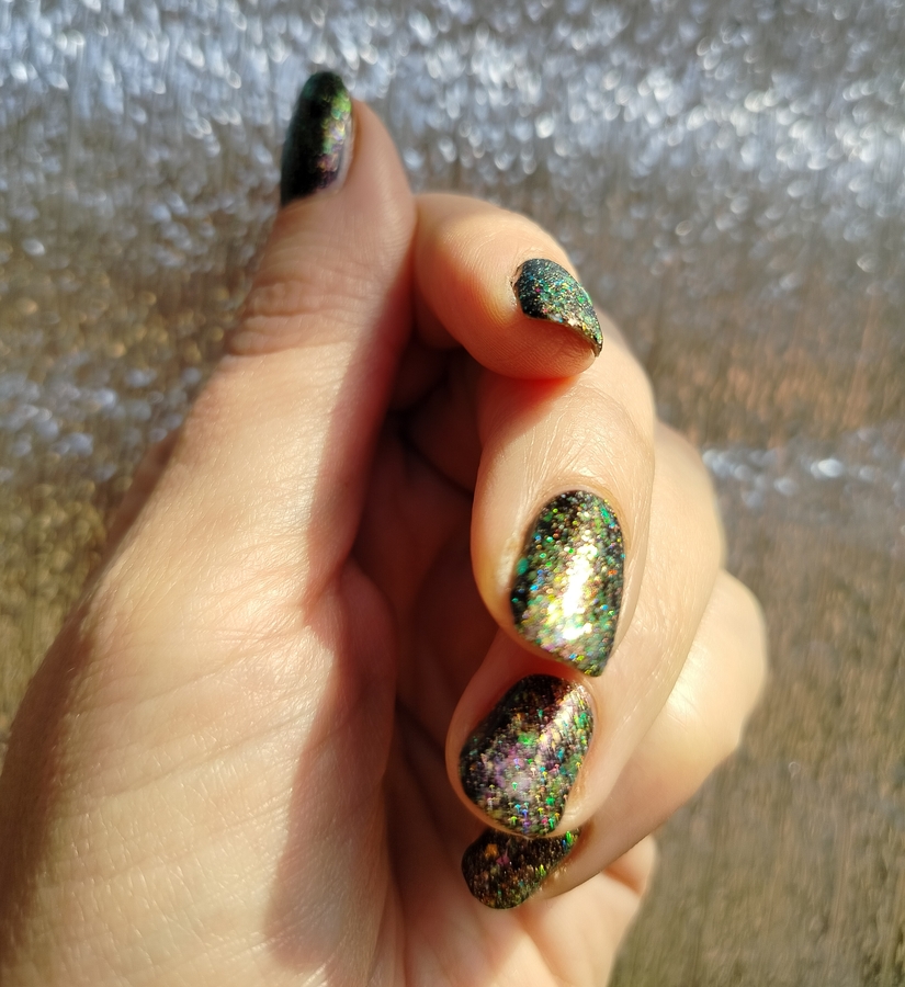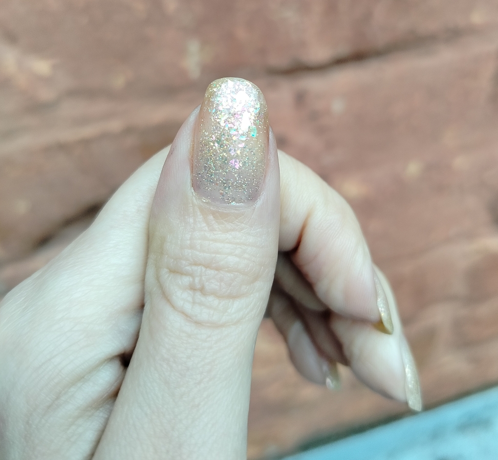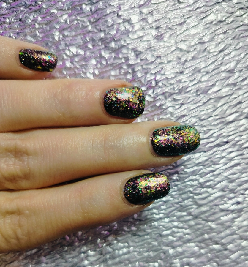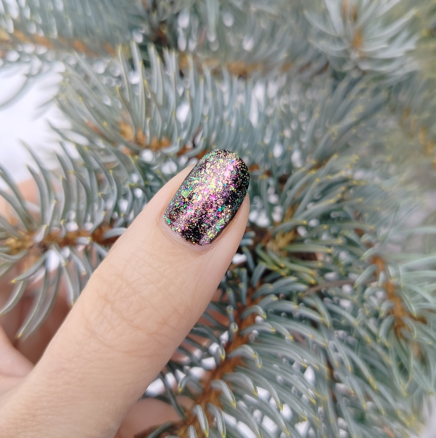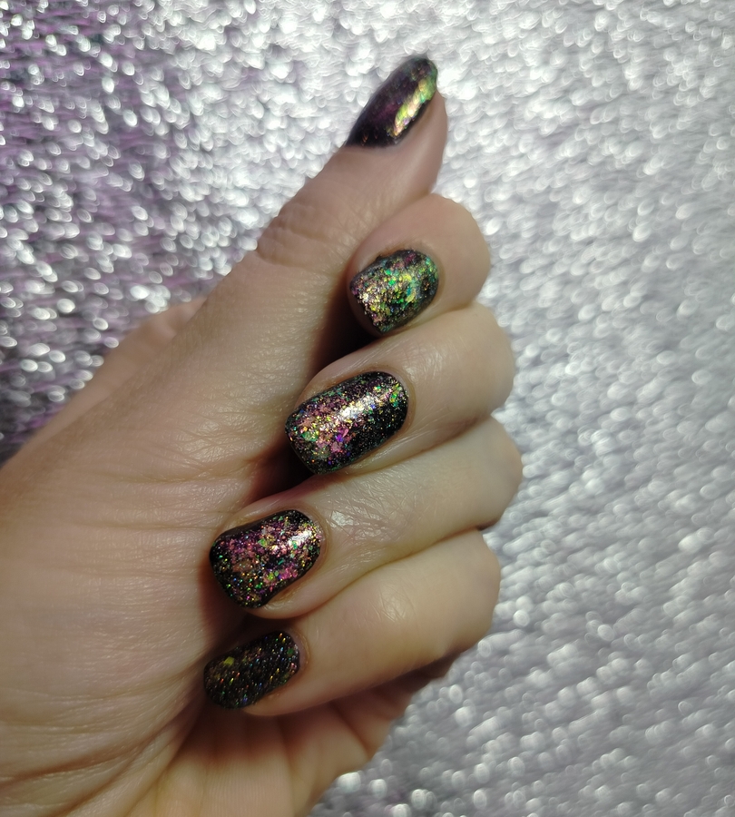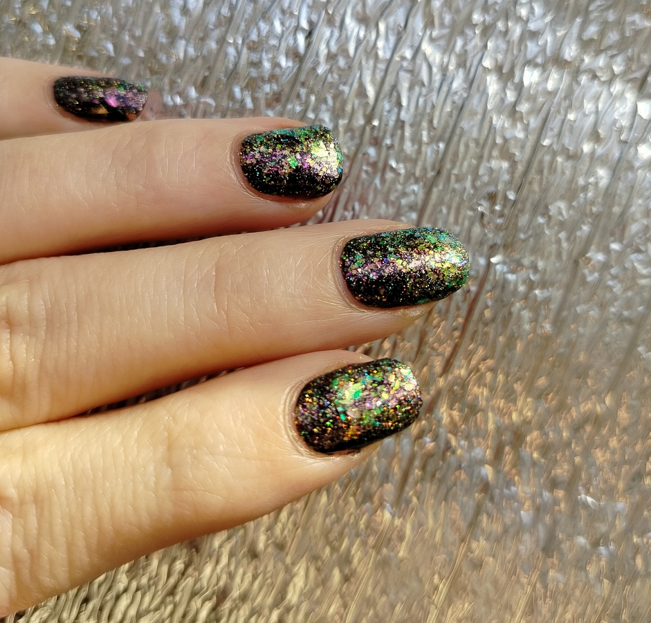 Оттенок Sparkler (Бенгальский огонь) — прозрачная, но достаточно плотная база с золотисто-зелено-розовой мультихромной слюдой, мелким золотым голографическим глиттером и радужным микроглиттером.