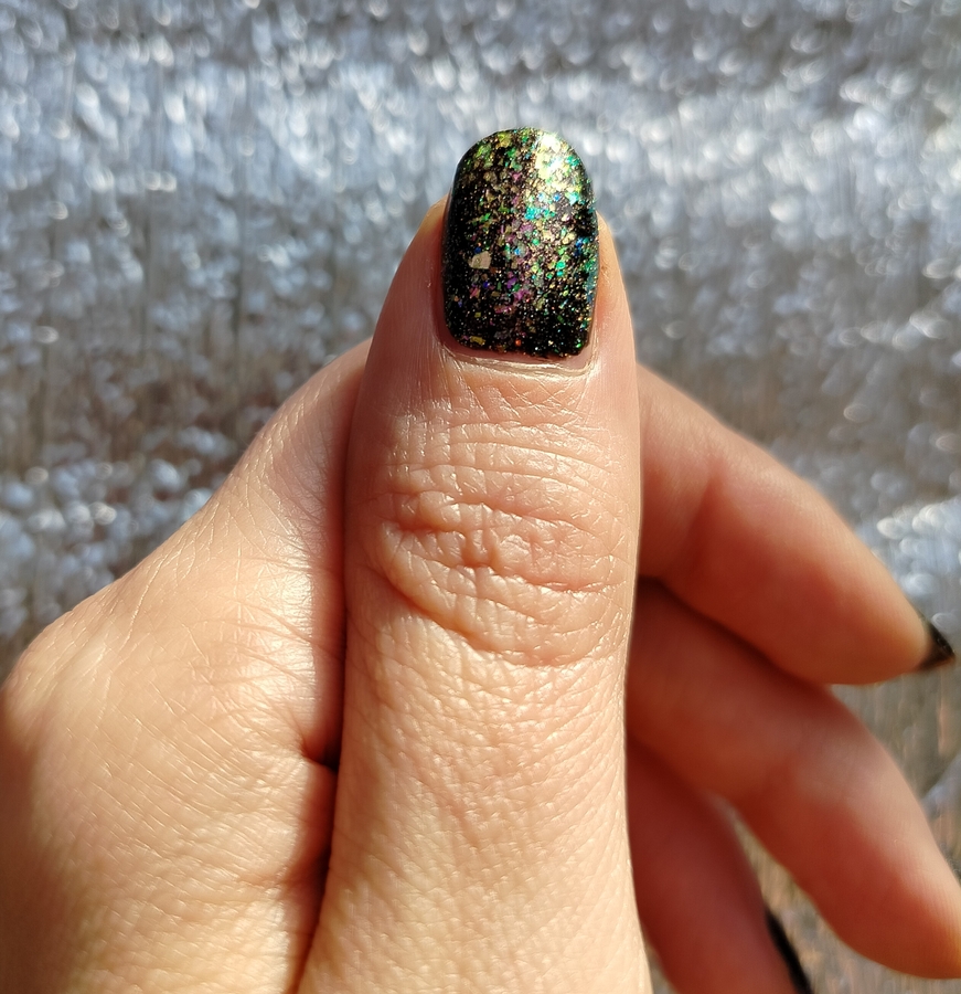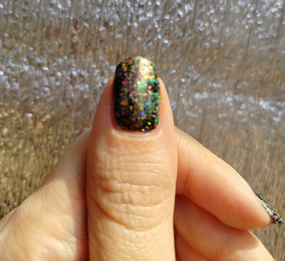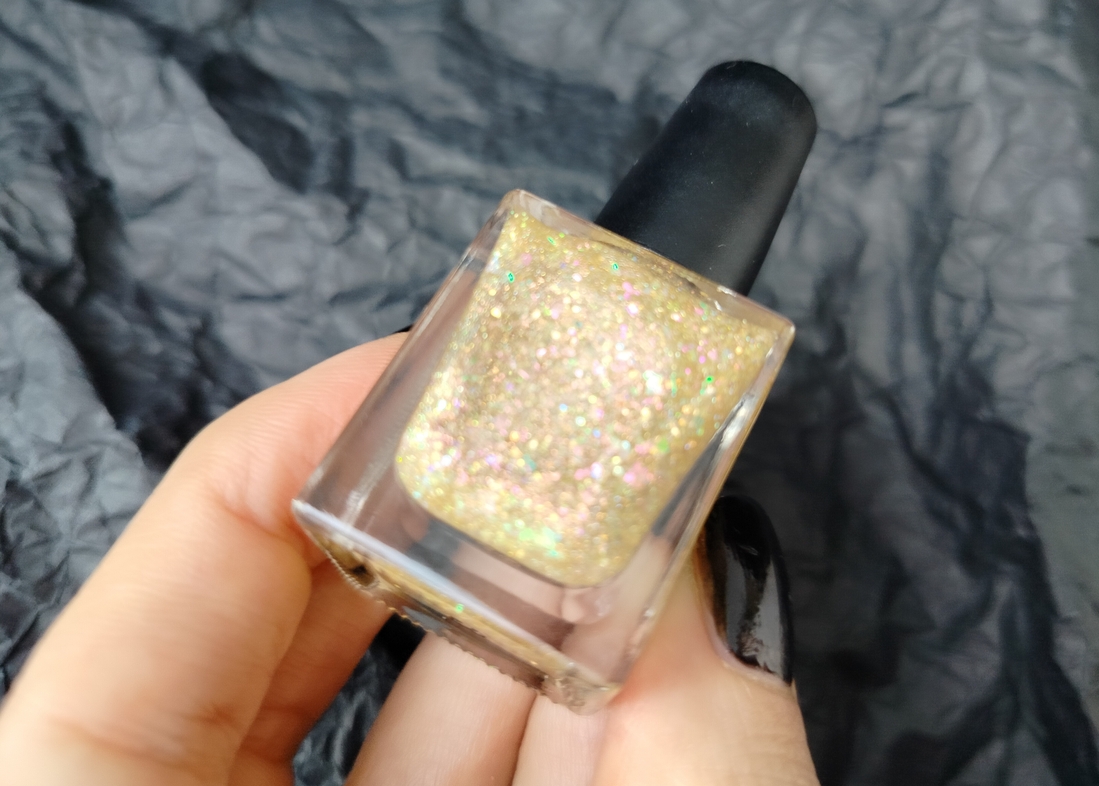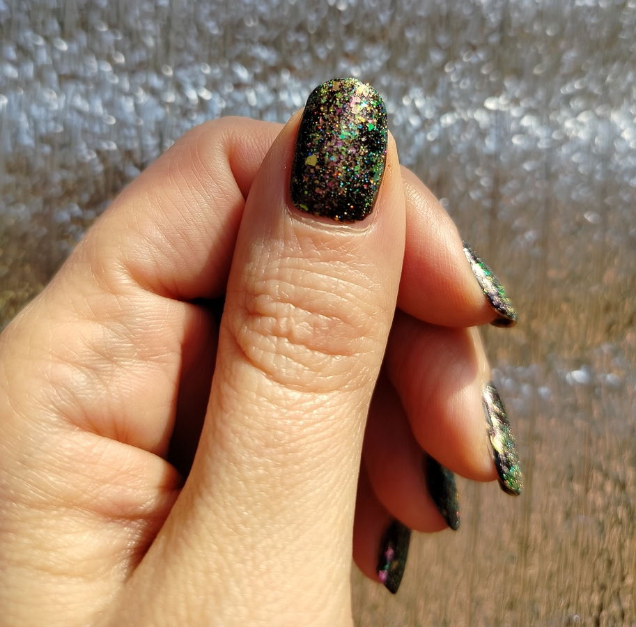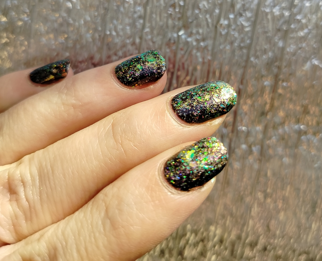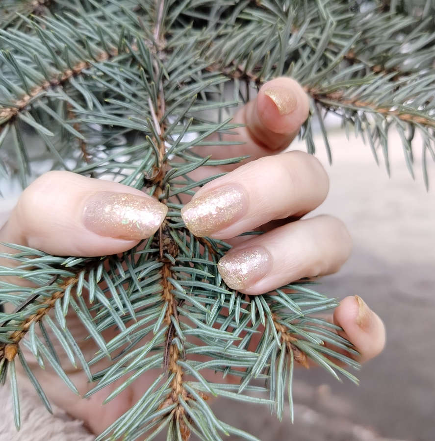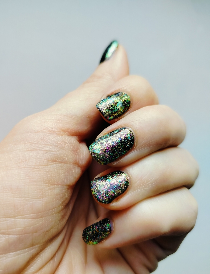 Оттенок Sparkler (Бенгальский огонь) — прозрачная, но достаточно плотная база с золотисто-зелено-розовой мультихромной слюдой, мелким золотым голографическим глиттером и радужным микроглиттером.