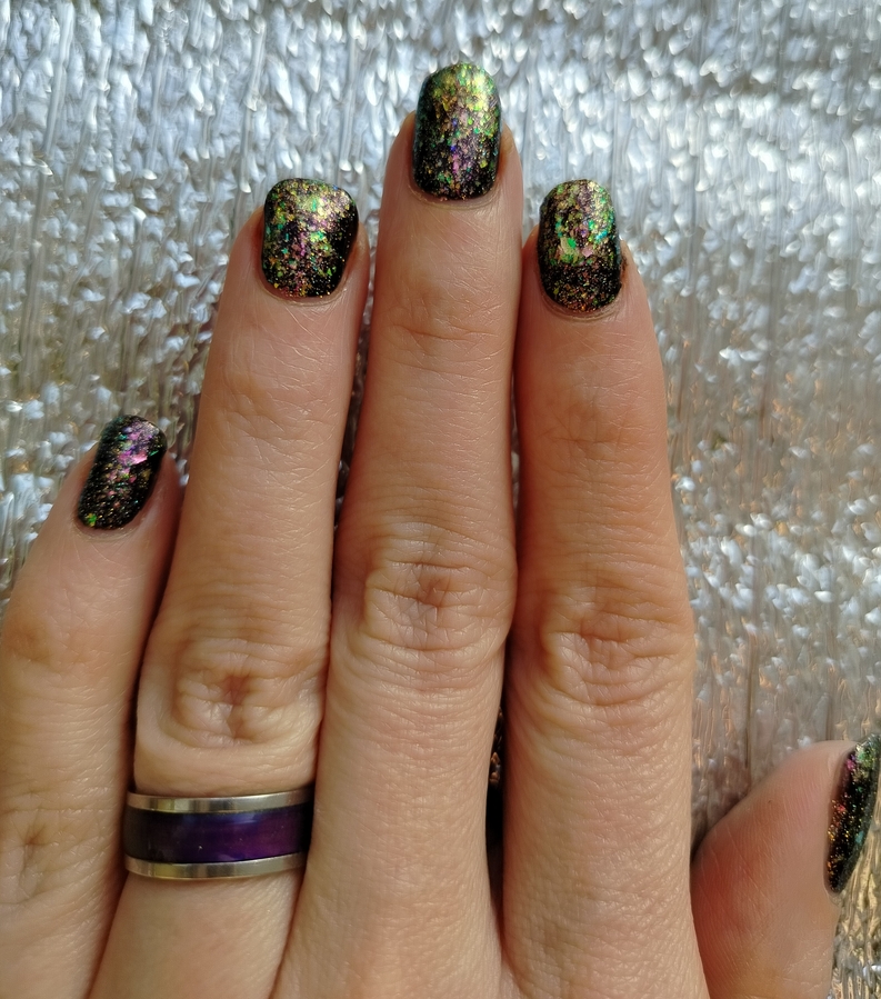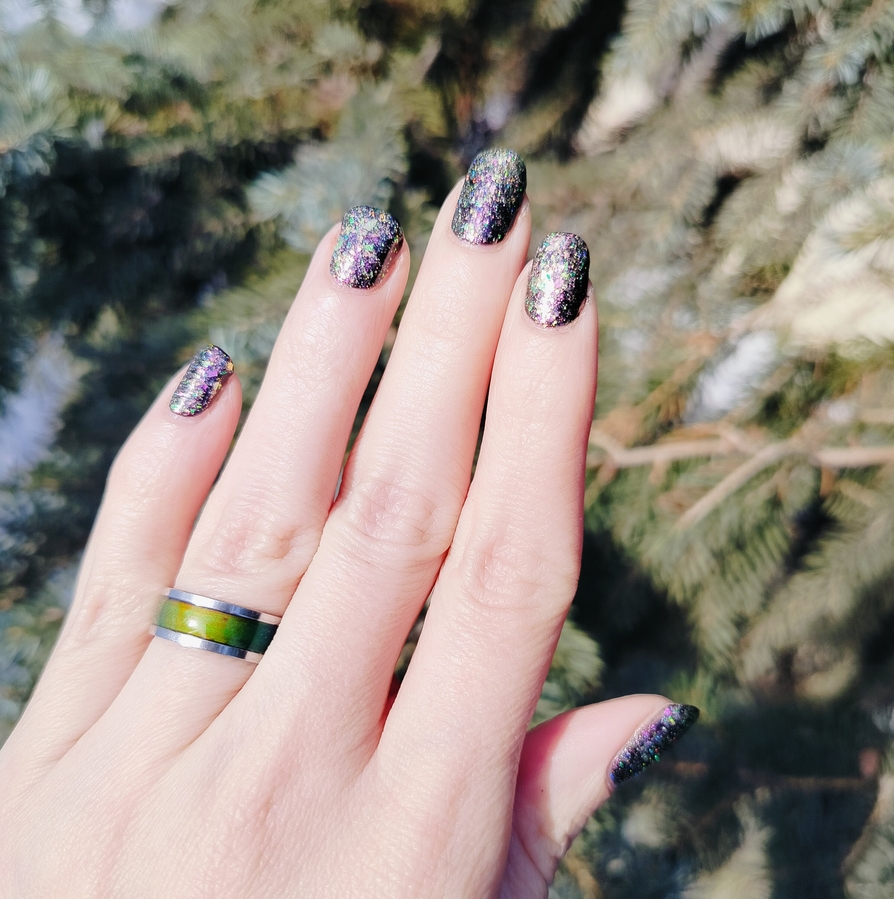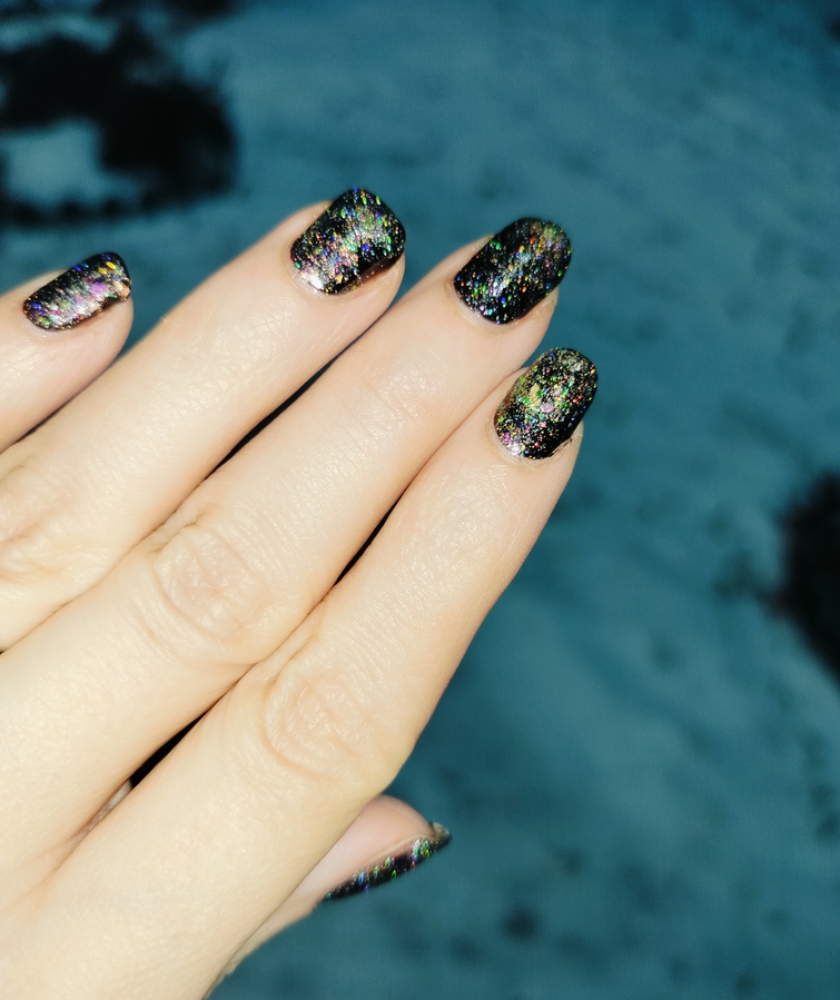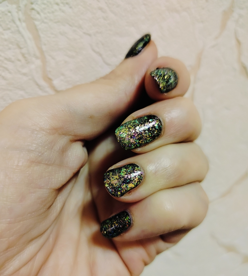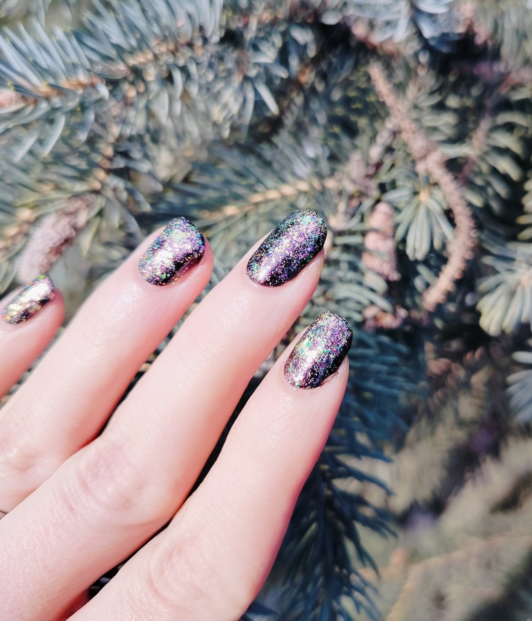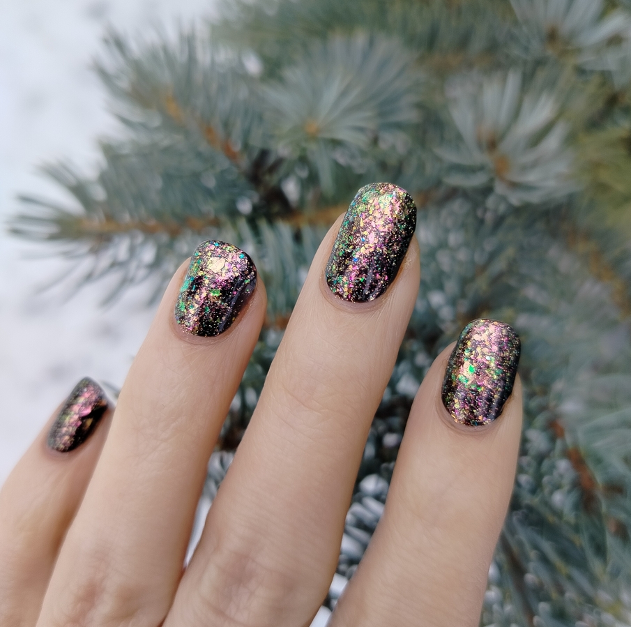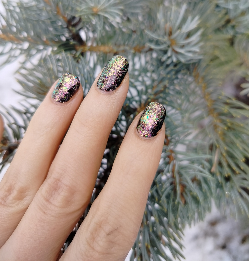 Гораздо круче и интереснее в качестве топ сверху темного однотонного лака (ниже у меня нанесен на «Черную кошку» от Masura). В этом случае появляется вся его красота — слюда шикарно светится и разноцветно переливается, ноготки становятся похожими на драгоценные камушки!