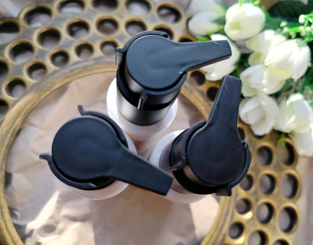 Набор представляет собой три пластиков флакона, оснащённых помповыми дозаторами.