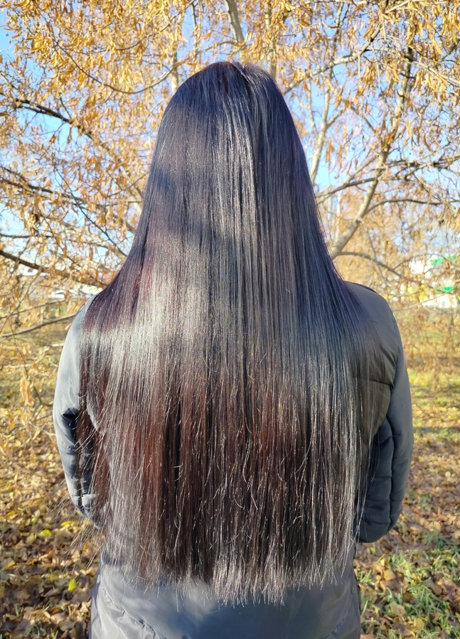 После нанесения третьего шага (несмываемого ухода), я уже понимаю, что будет «перегруз» — при сушке феном волосы сохнут дольше обычного, на ощупь тяжёлые, гладкие, но сбиваются в пряди, «сосулят».