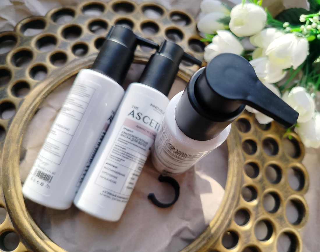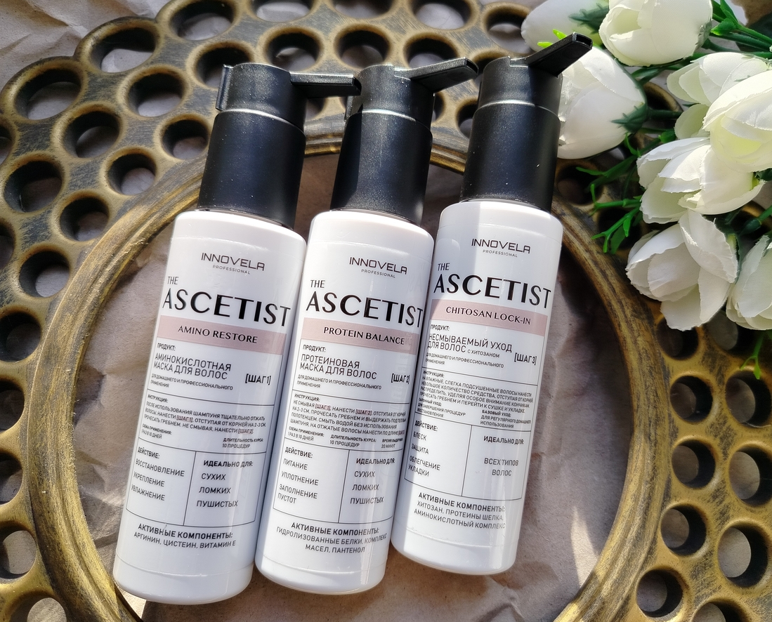 Я давно интересуюсь холодными интенсивными восстановительными процедурами и стараюсь быть в курсе появляющихся новинок на «волосяном» рынке. Предлагаю вашему вниманию набор для холодного восстановления Innovela The Ascetist: Amino Restore — аминокислотная маска, Protein Balance — протеиновая маска, Chitosan Locking — несмываемый уход с хитозаном.