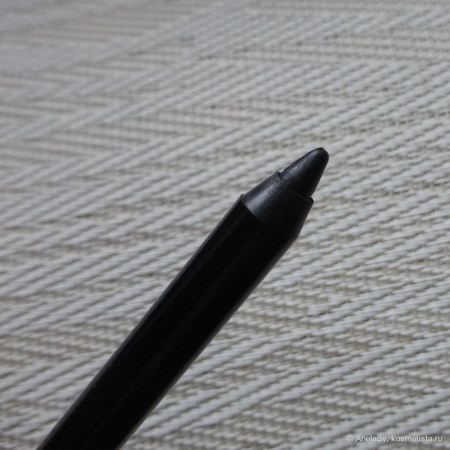 По текстуре карандаш гелевый и очень мягкий — полностью оправдывает статус кайала. Цвет — насыщенный, угольно-чёрный, без серого или мутного подтона. Ложится ярко с первого касания, в том числе по слизистой, и без проблем растушёвывается. Но важно не тянуть время — он достаточно быстро фиксируется и потом уже не двигается.