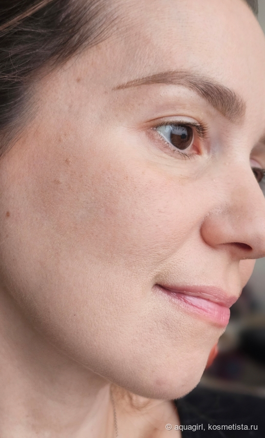 Тонкий слой пудры на тонком слое тональной основы выглядит так. Кожа осталась живой, при этом поры сглажены и появился лёгкий матирующий эффект.