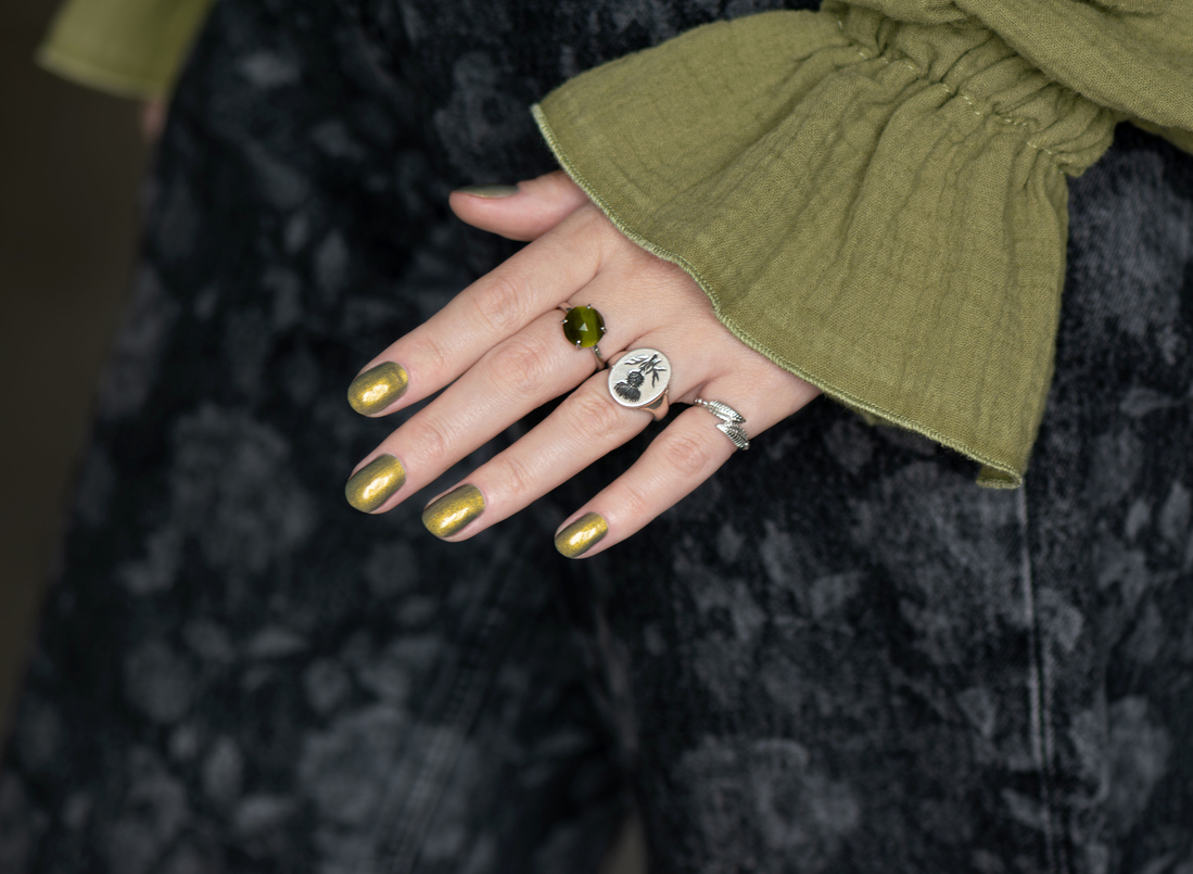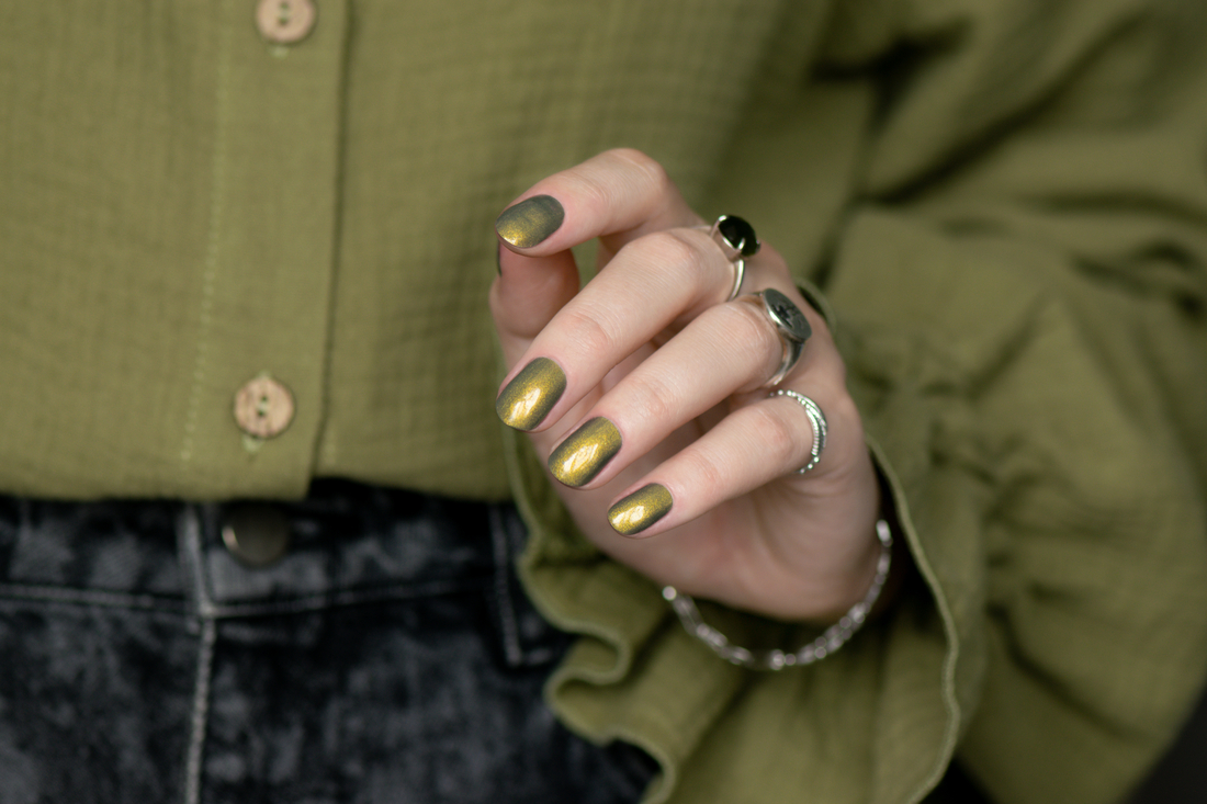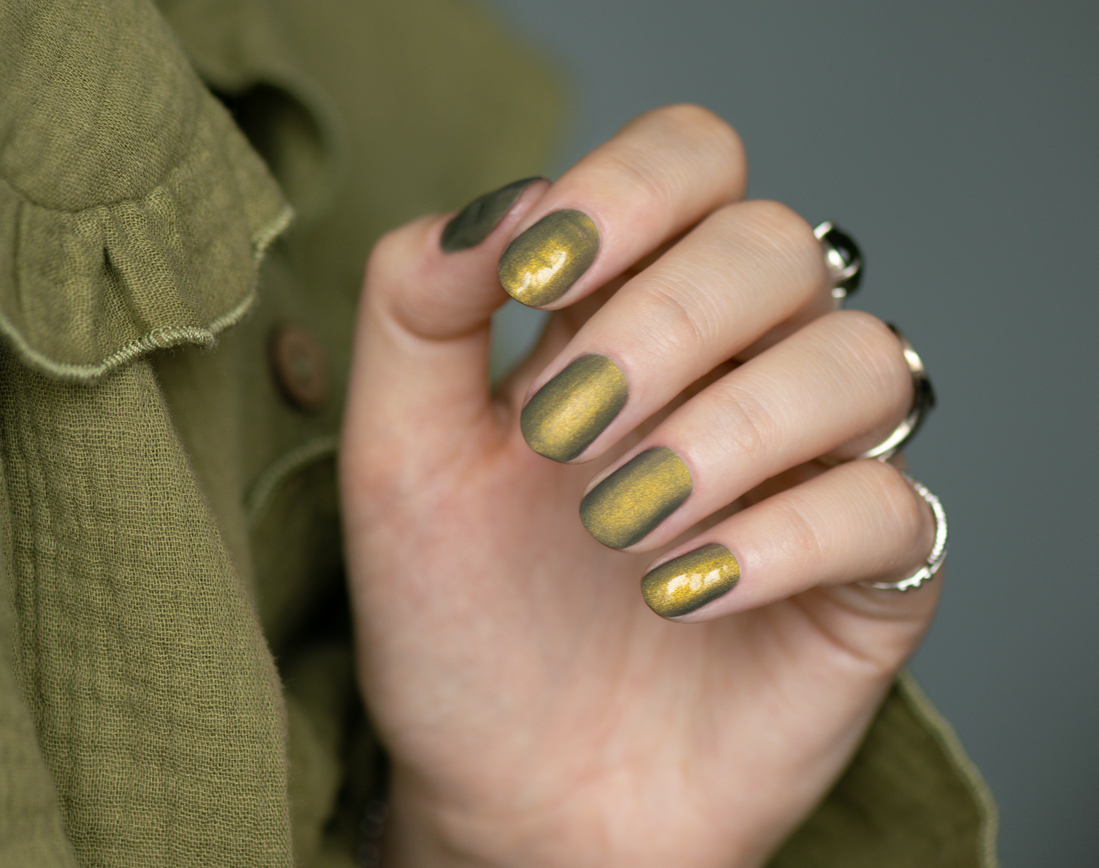 Финиш матовый. Мне он не очень нравится, поэтому я воспользовалась глянцевым топом, под которым шиммер сразу вспыхнул и заиграл)