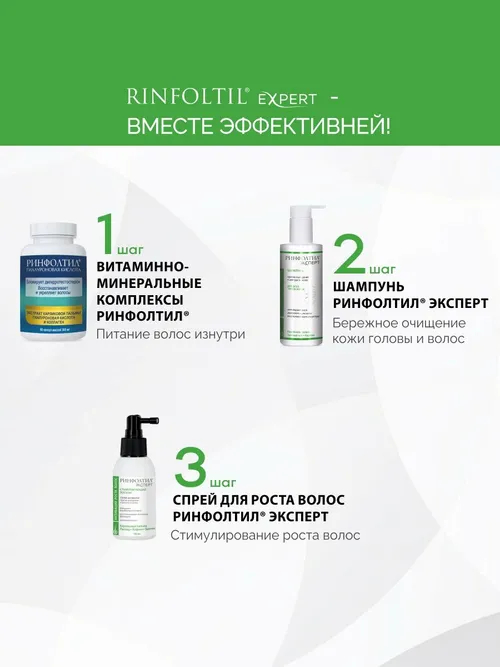 У Ринфолтил есть целая куча продуктов от облысения: для женщин, мужчин, детей, ампулы с витаминами, с пептидами, шампуни, спреи, кондиционеры и БАДы. Выбираем тот, что будет работать с нашей проблемой. У меня спрей эксперт зелёный. И вот почему.