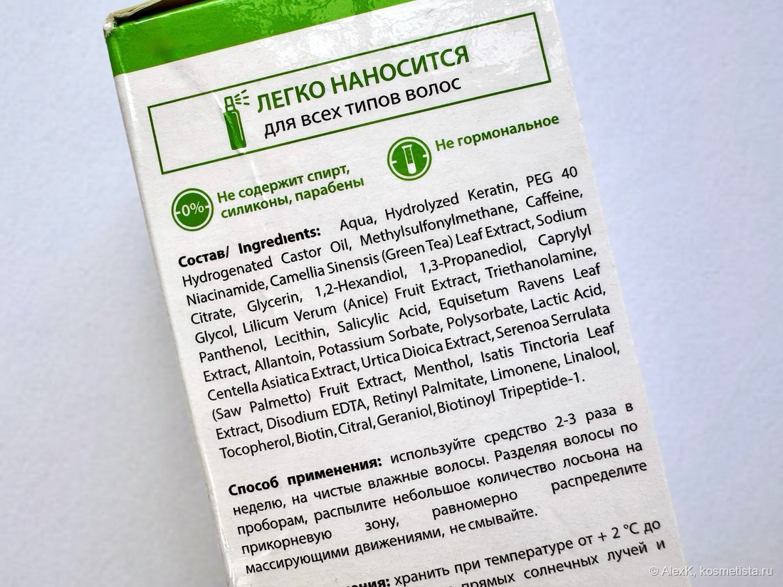 Упаковка. Спрей приехал в картонной коробке, защищённой слюдой. Мне нравится, что на главной стороне производитель указал основные активы. А сбоку — для какого типа алопеции подойдёт средство.