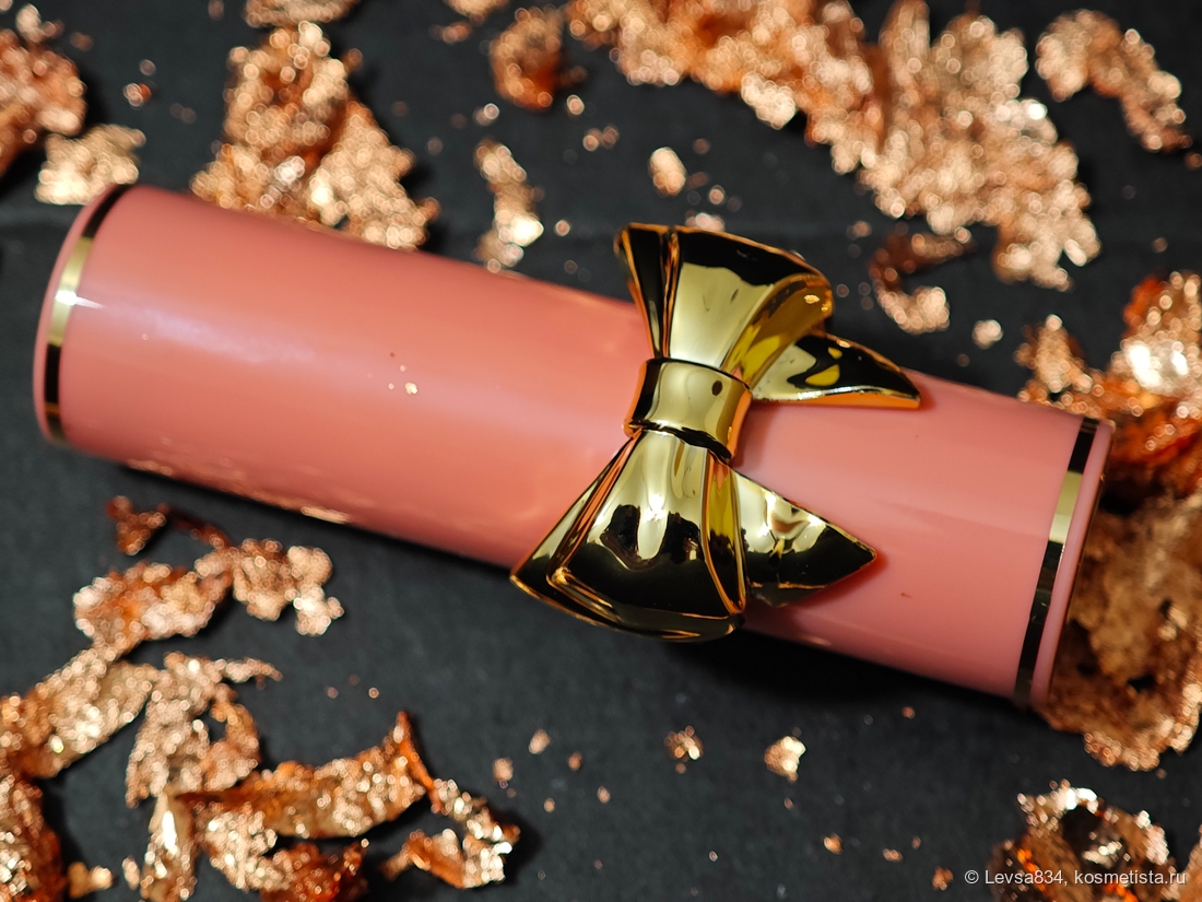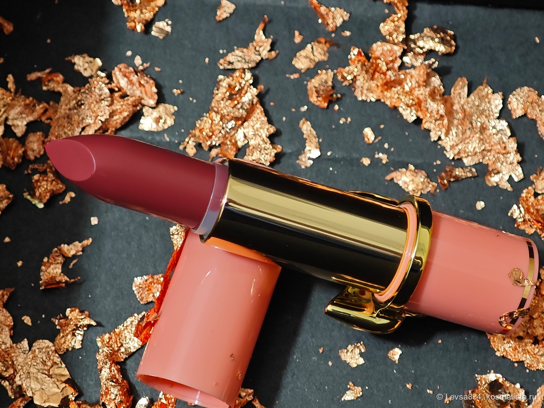 Футляр из плотного качественного пластика, украшен золотистым бантом. Колпачок закрывается плотно, с щелчком, надёжно — я часто ношу помады Пэт в сумке и косметичке, самопроизвольно они ни разу не открылись.