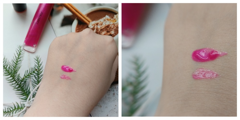 Оттенок 08 это яркая фуксия с холодным подтоном и розово-серебристым шиммером. Блеск можно наслаивать, но все равно на губах он выглядит очень прозрачным. На коллаже ниже свотчи в разном приближении. Ниже блеск нанесен в один слой, выше в три слоя.