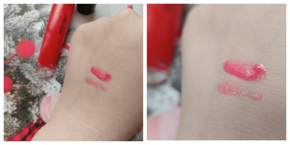 Оттенок у блеска нейтральный красный с мельчайним золотистым шиммером. Разумеется на губах он будет прозрачным. Хотя его можно и наслаивать, он неплохо ложится в несколько слоев. На коллаже ниже на обеих фотографиях снизу один слой блеска, сверху два слоя.