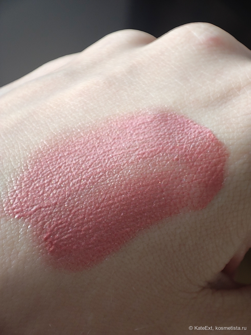 Финиш слегка сатинит (если можно так сказать о румянах), но выглядит вполне естественно. Текстура у румян бархатистая, кремовая. Их можно как растушевать в ноль, так и наслоить до состояния Марфушечки-душечки. Однако если сразу взять лишнего, то тушевка превращается в настоящее испытание. Кроме того, у этих румян есть один жирный минус, и его видно даже на свотче на руке: румяна западают в складки и неровности кожи. Если у вас гладкая кожа лица — проблем вы не увидите, но если, как у меня, у вас расширенные поры, то, увы, но румяна непременно в них залягут.