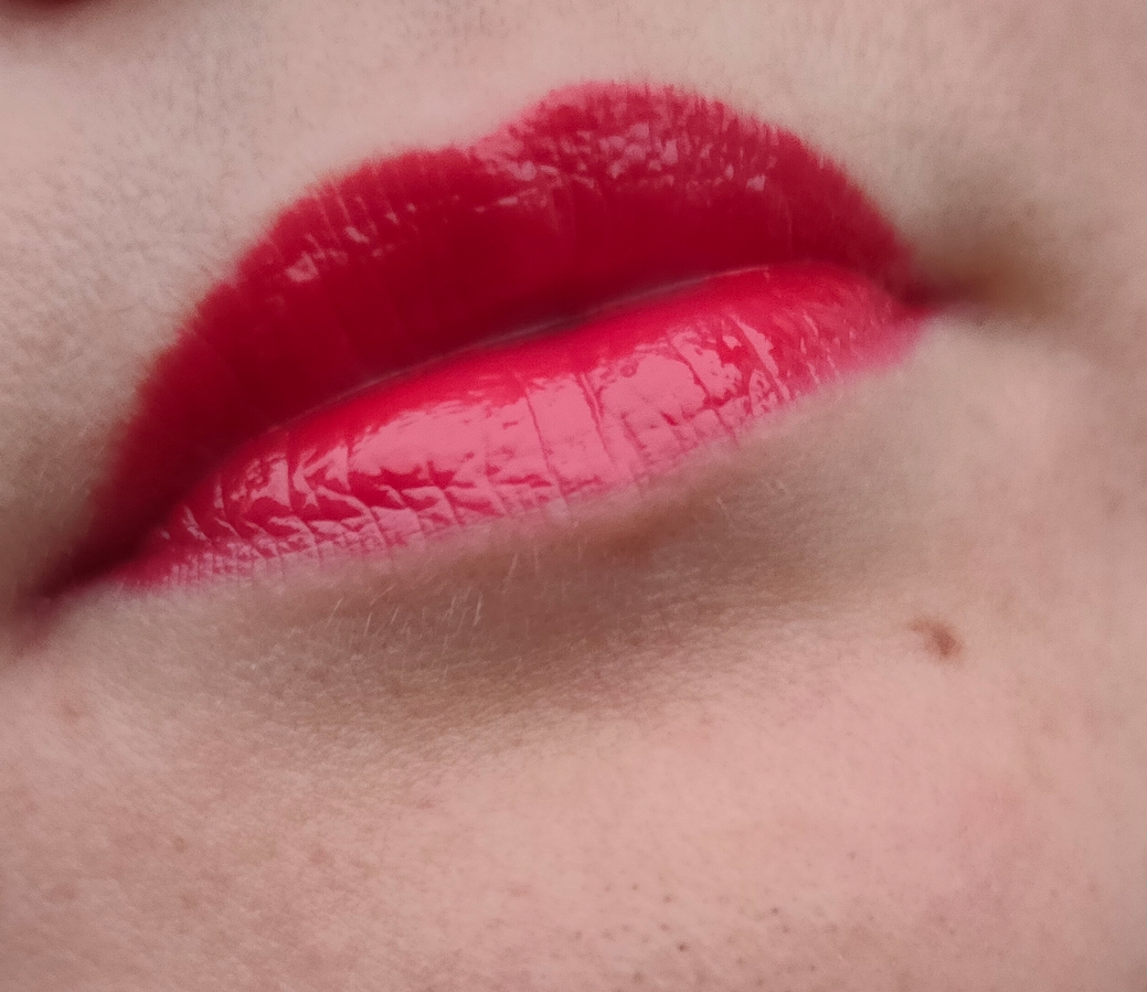 Помада наносится без проплешин, таким ровным, ровным слоем. За счет блестящего финиша, объём губ не уменьшает, а скорее увеличивает.